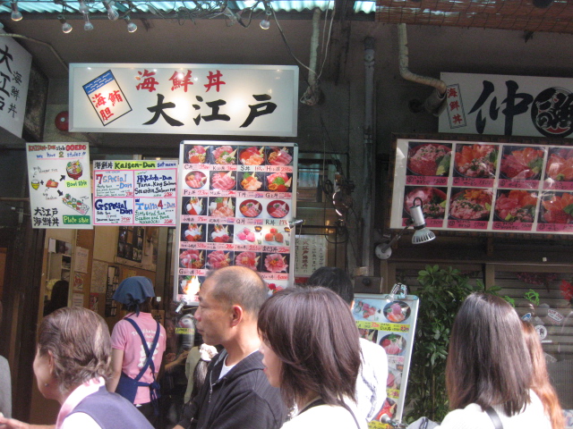 早めの昼食にして早めに並んだ方が無難かもしれない。小さな店でものすごい行列。私たちが行った時は日本人ばかりでしたが、外人観光客も多い様子。種類が多すぎて悩んでしまうので、並んでいるうちに決めておいた方がよい。一番人気は大江戸ウニ盛り北海丼だそうです。