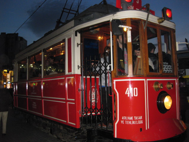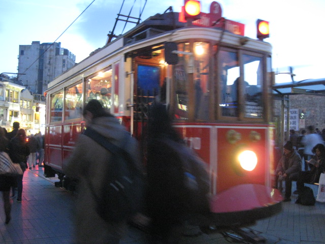 タクシム広場から、イスタンブールでも一番の繁華街で、人通りの多い、イスティクラル通りの真ん中を通って、トゥネル駅までの間約1640mを走る路面電車で、途中3か所で乗降が可能です。通りは人があふれんばかりにたくさん歩いているので、人の姿で路面電車が来ても見えないくらいです。