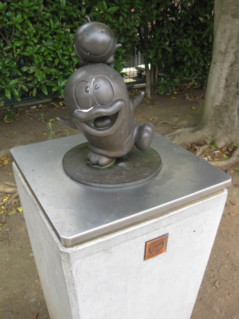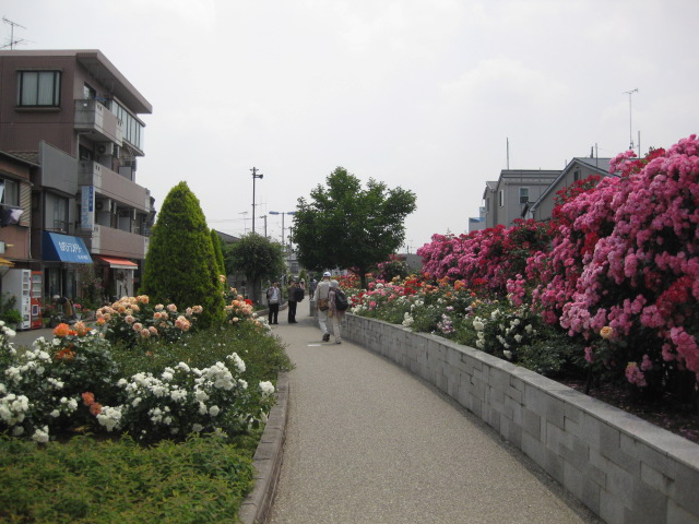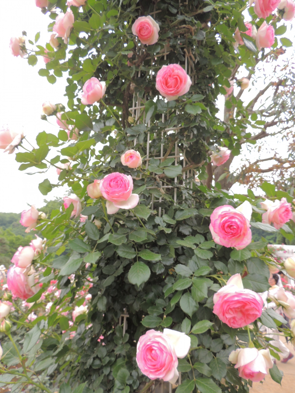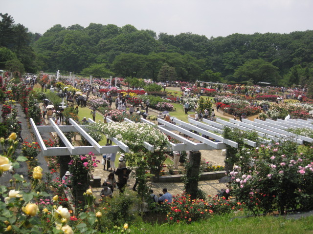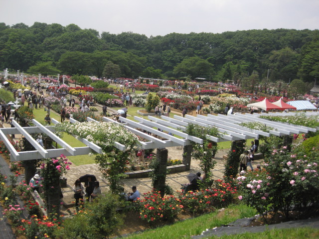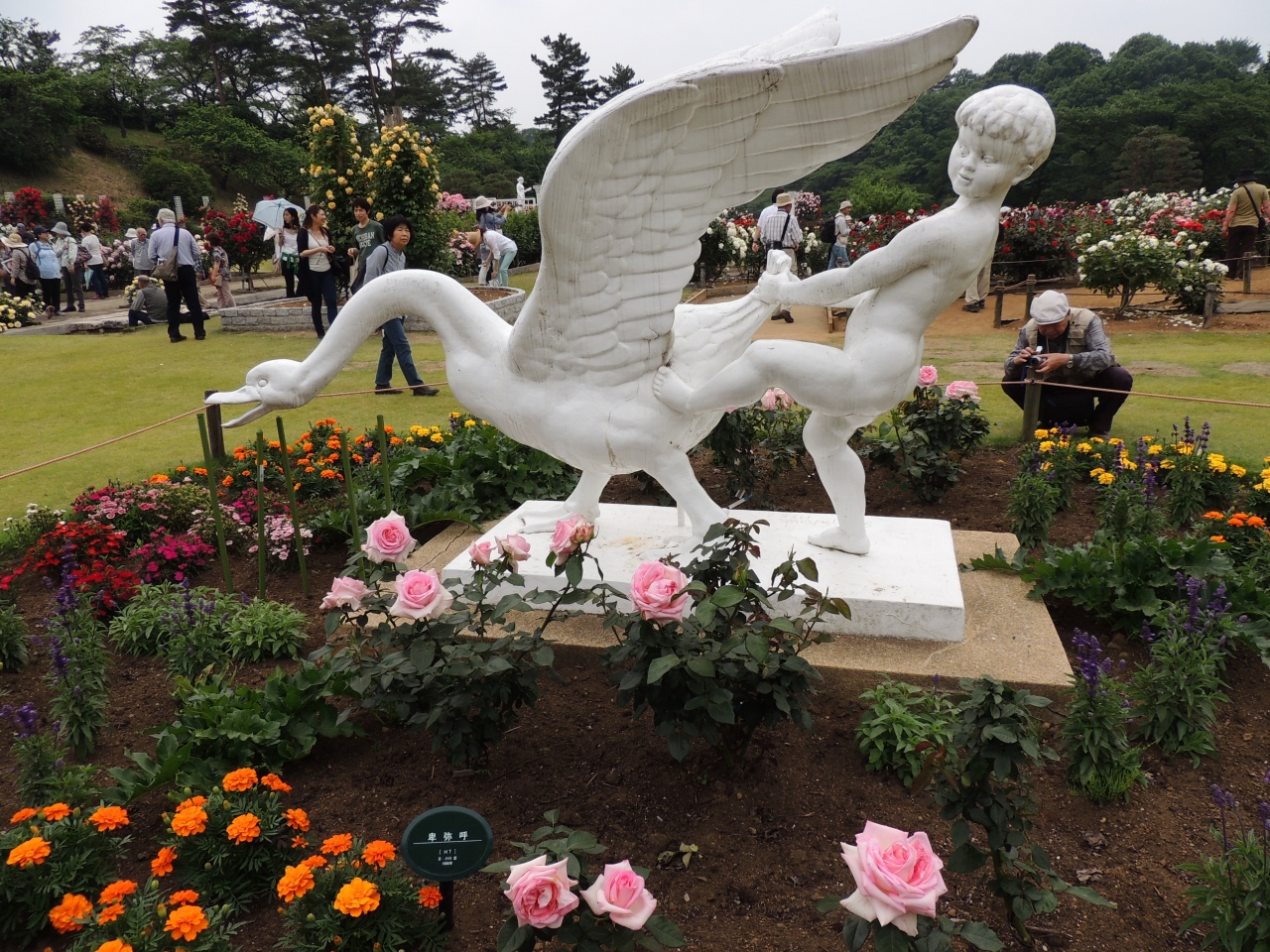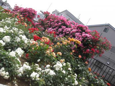 昨年も今年も早めに暑くなり、バラが開き過ぎると美しくないので、手遅れになる前にあわてて行ってきました。火曜日の午前10時過ぎに向ヶ丘遊園駅を出発。ダイエー脇の歩道を行くとオバQとバラが出迎えてくれました。現地バラ苑は60代以上の男女がほとんどでしたが、かなりの混雑でした。春と秋の年2回公開。春は530種、4700株。2014年春は5月15日~6月1日まで開園。入場料は無料ですが、ボランティアの方々のご努力でとても美しいバラを楽しませていただけています。なので皆さん多少の気持ちを表し寄付されています。
