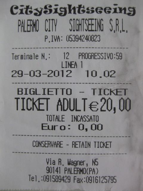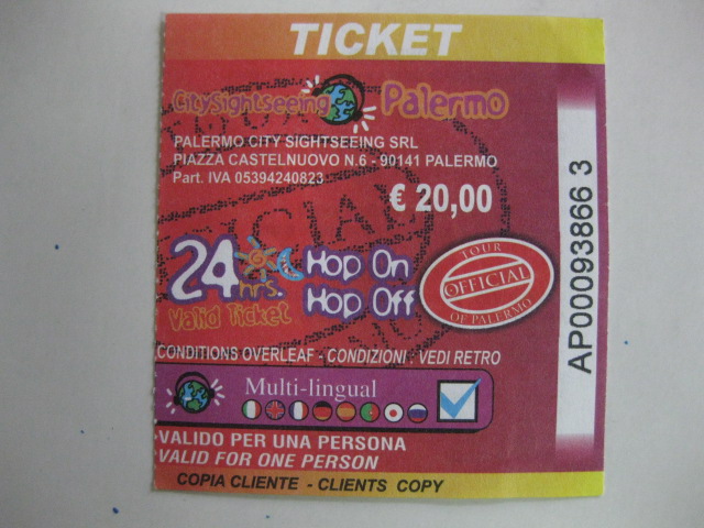 日本語のイヤホンガイド付きで、まずこれで一周すると、パレルモ市内がよくわかる。大人€20、子供€10は、現地の物価から考えるととてもお高いので、3月末ですが、乗客はほとんどいませんでした。車掌さんの若いおねえさんがとても親切でフレンドリーでした。