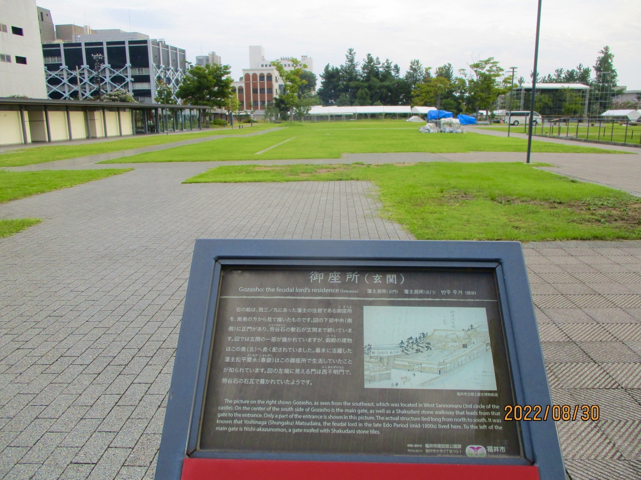 福井城址の近くの中央公園が大規模に整備された際に、設置された公園内の展示・休憩施設で、無料で利用できました。福井藩主の住居である「御座所」だった場所にありました。大きな水平屋根と均等スパンの列柱によるシンプルな外観でした。
