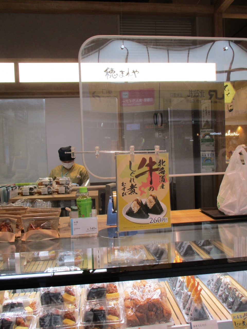 エキュートの出入り口側に小さな店舗があって、おにぎりやお惣菜が並んでいました。近くにお勤めのOLさんなどが利用していました。試しに、お惣菜を少し購入しましたが、特別美味しいとは感じず、まあ普通でした。