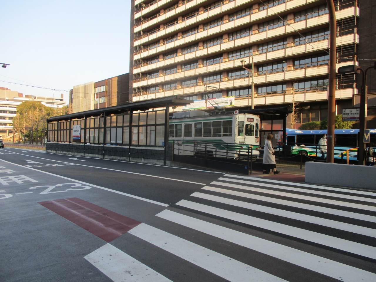 熊本城を観光した後、市電の1日乗車券を利用して、ここから、熊本駅前停留場まで乗車しました。この停留場まで、桜の馬場 城彩苑から長塀通りをゆっくり歩いて、10分弱かかりました。停留場の名前は熊本城ですが、思ったより遠かったです。