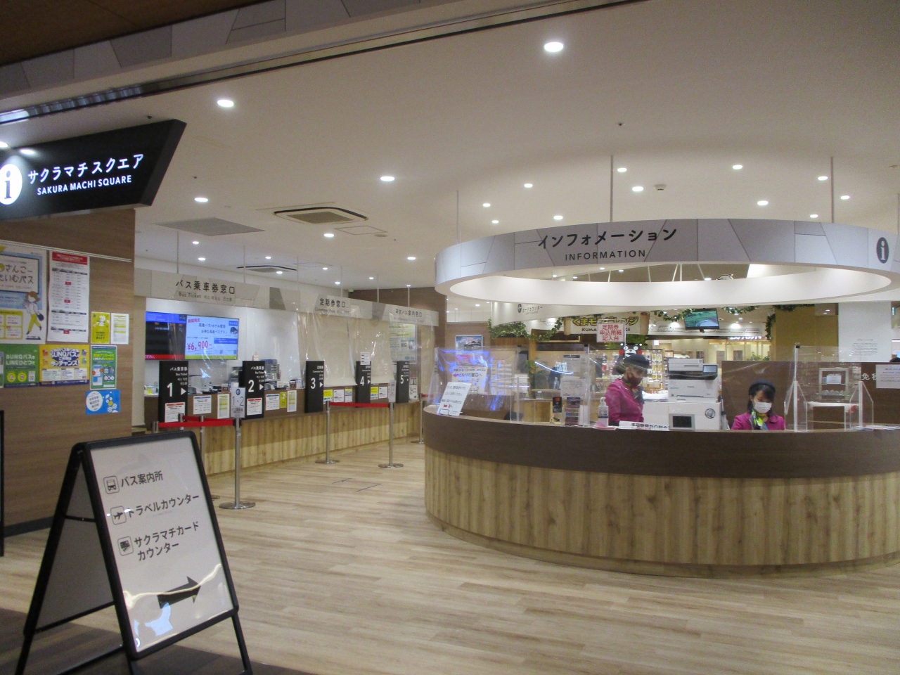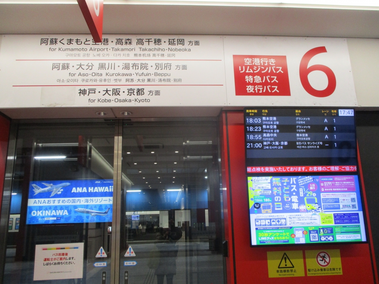 熊本では、くまもと阿蘇空港から熊本市内、熊本市内から阿蘇、天草などへ行くのに、産交バスを利用しました。路線バスも快速、特急バスも、桜町バスターミナルから沢山の路線が出ていました。バスターミナルの2階にバスの案内所がありました。