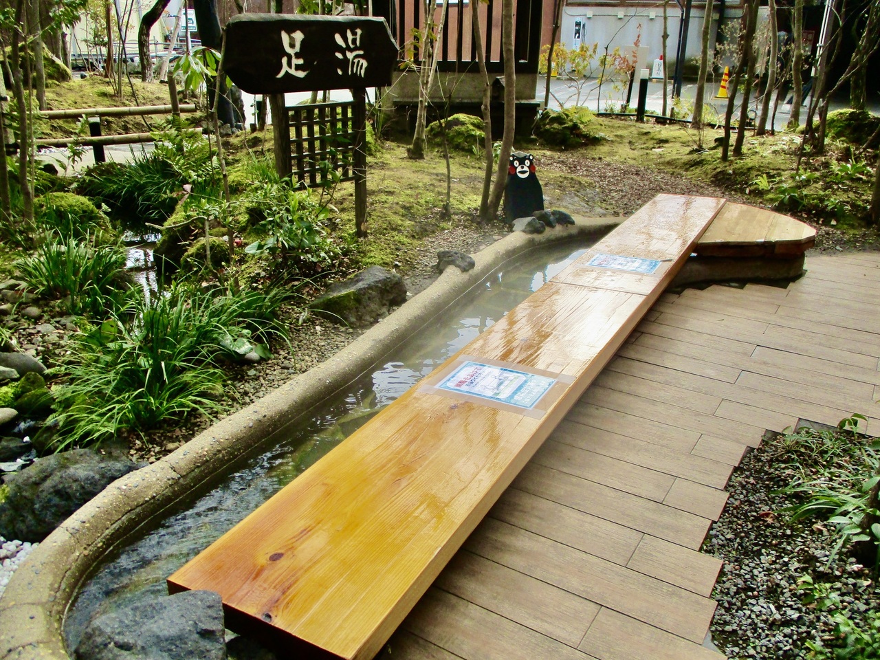 どちらかというとオフシーズンにあたるこの時期でも他館とは違い、多くの宿泊客で賑わっていました。コロナ禍で立ち寄り入浴は不可でした。入り口に小さな庭園と池があり、鯉が泳いでいて、その近くに足湯がありました。
