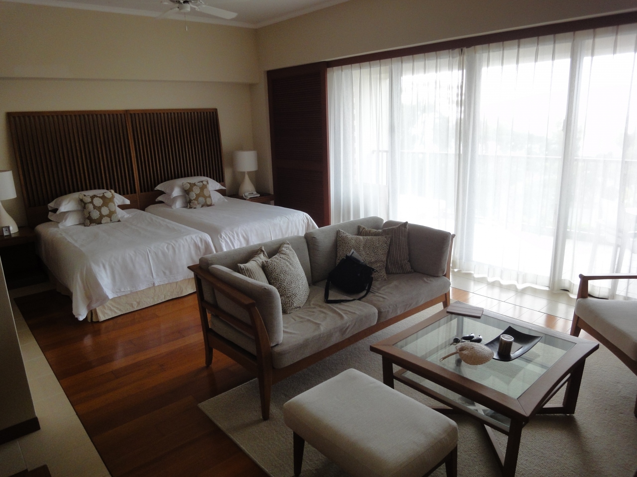 家族大人4人で、クイーンベッド2台のシービュールーム、クラブルームアクセスに宿泊しました。