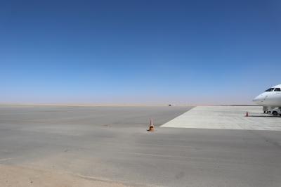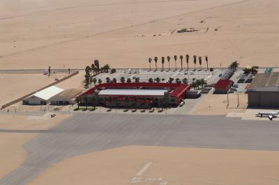 周囲は砂漠に囲まれた空港。滑走路と赤い屋根の建屋がポツンとあるだけです。
