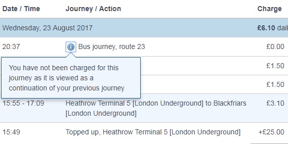 なお、今回の利用でオイスターの明細を確認したところ、チャージされるべきところがゼロになっていました。調べてみると、HOPPER FAREと呼ばれる乗り継ぎ割引制度で、「最初のバスでのオイスター・タッチから、1時間以内に乗り継いだバスでタッチをした場合、後のバスは無料」というもので、2016/9に導入されたようです。