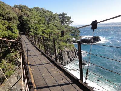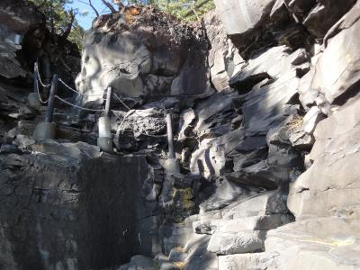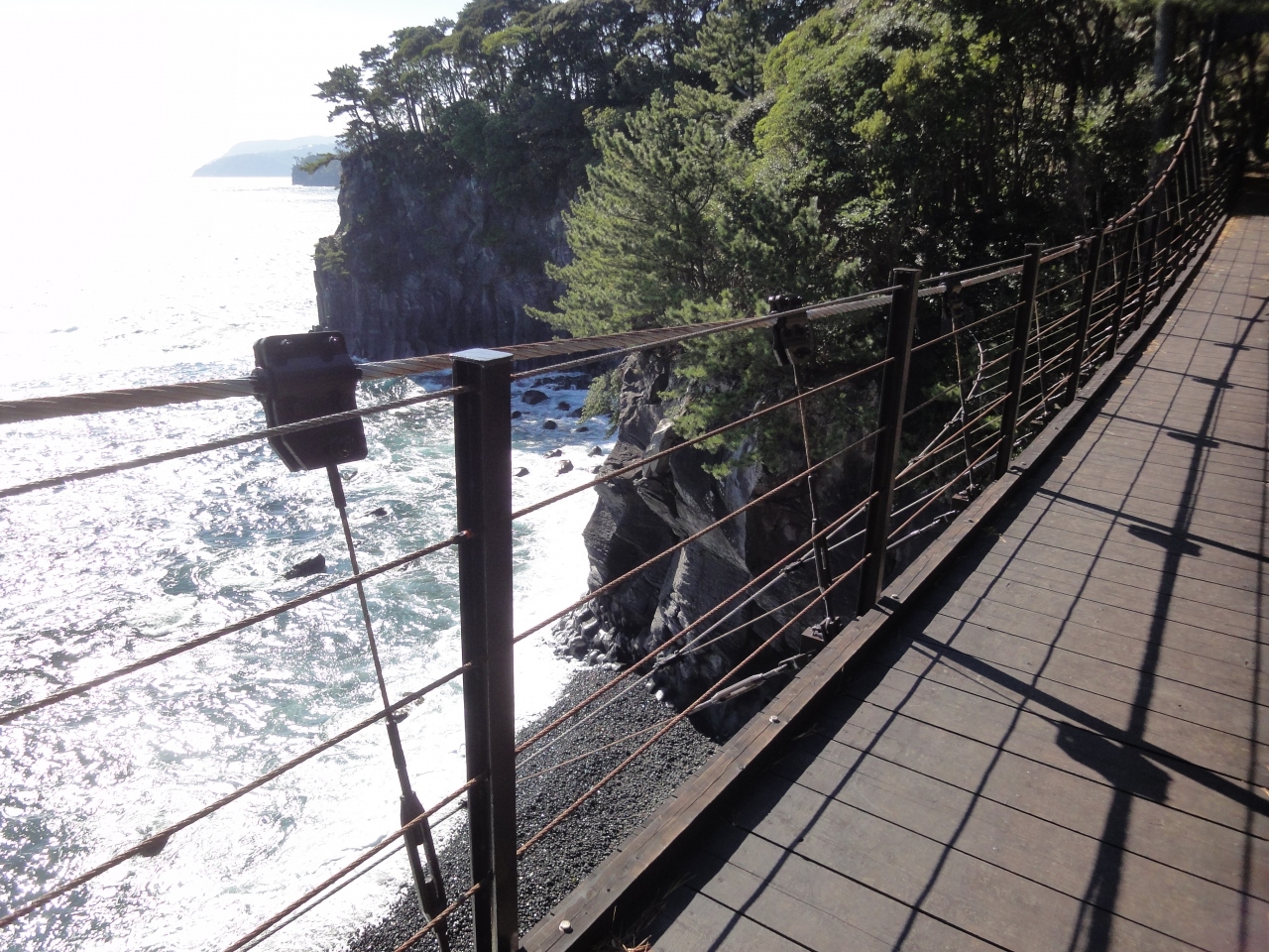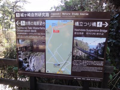 城ケ崎自然研究路まで750m、研究路を右折し、橋立吊橋までの途中に海岸への降り口があるので、下っていきます。岩場の道なので注意が必要です。