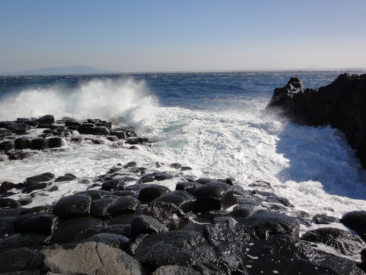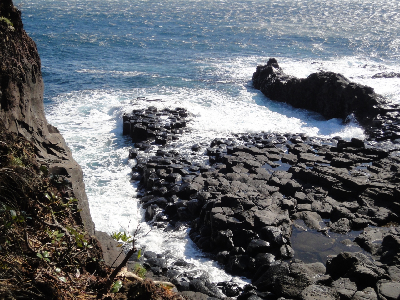 岩礁にある大小の汐溜まりが「大淀・小淀」と呼ばれています。穏やかな時は天然のプールとして親しまれているようですが、この日はやや波も荒く、それはそれで、岩礁に砕け散る波の大迫力に感動しました。危険回避のため、水際に近づけなかったのが残念でした。- 旅行時期