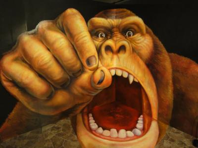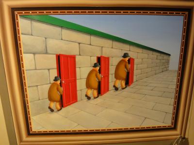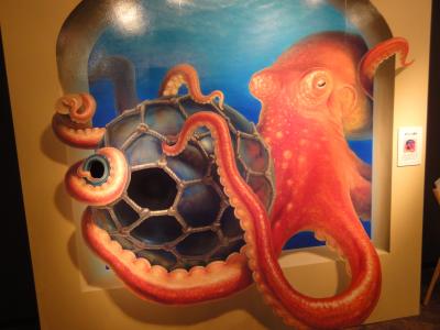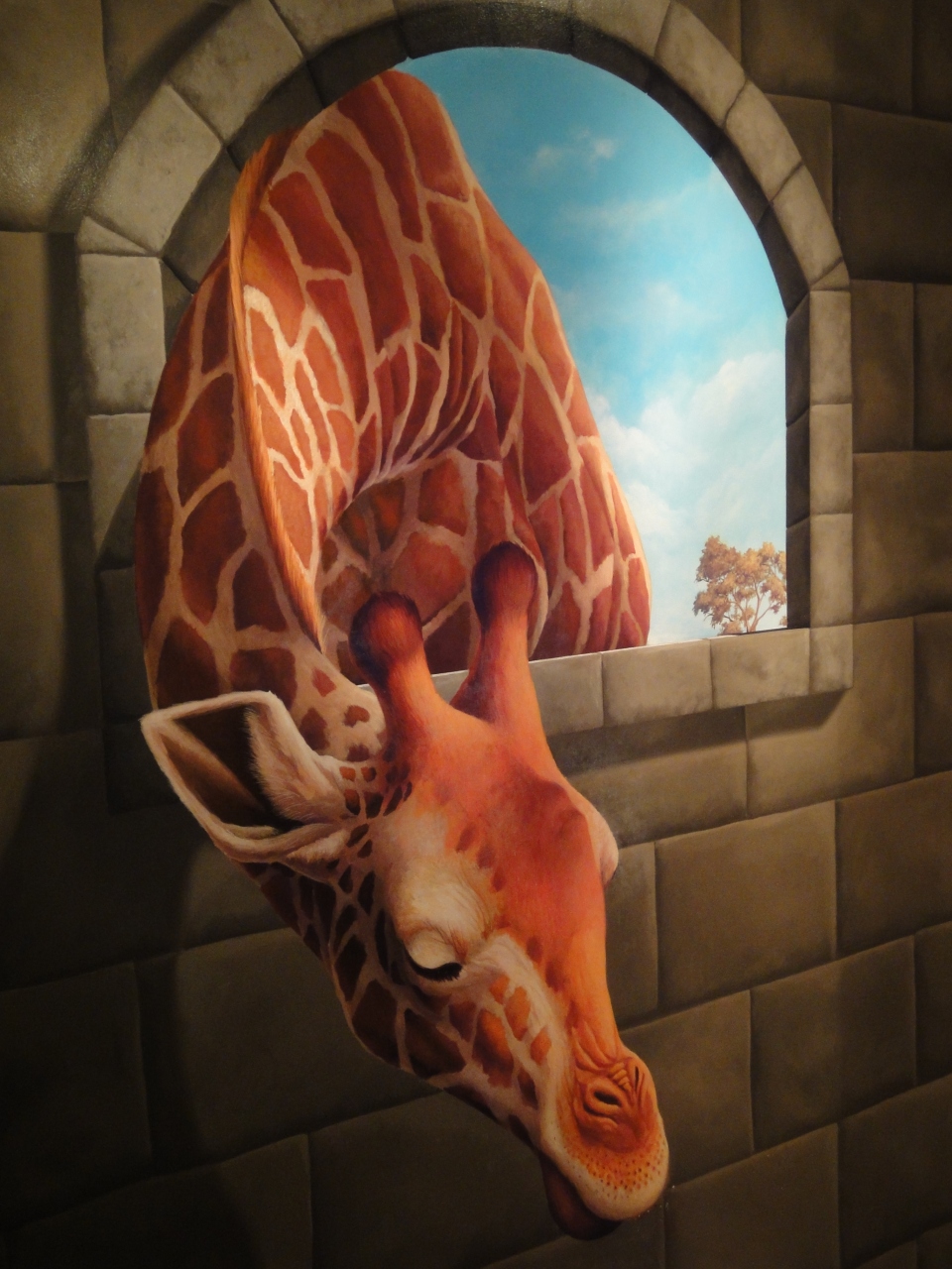 写真を撮ると動物が飛び出して見える絵画、また、目の錯覚で揺れて見えたり、大小・前後が反対に見えたりするトリックアートが、これでもかと続きます。