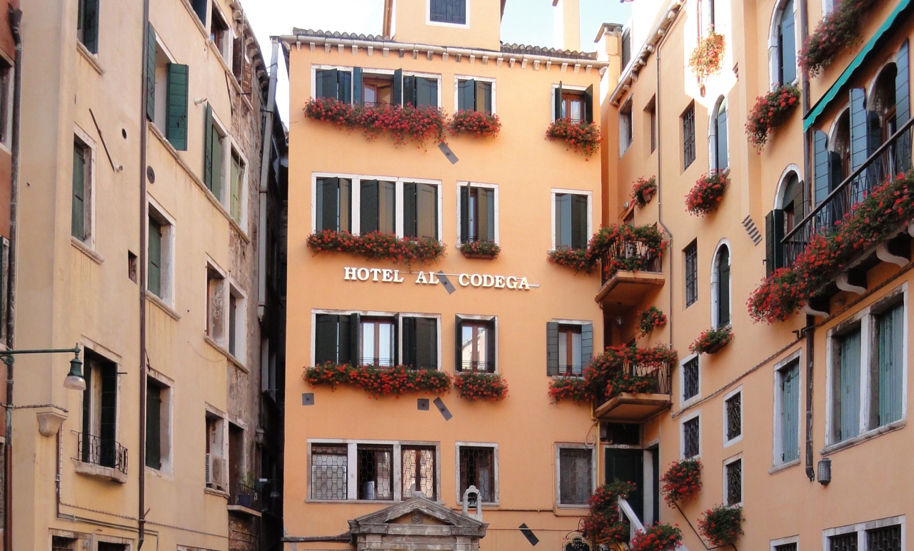 水上バスのリアルト橋で降りて、徒歩5分程度。最初は入り組んだところでちょっと迷いますが、地図を見れば大丈夫です。とてもきれいな中庭に面したホテルです。(その中庭をたくさんの観光客が写真を撮っていました。)