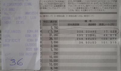 アルゼンチン側イグアスの滝公園内のレストランで、ペソでの請求額が306ペソのレシートを受取るときに、「米ドルだと36ドル」と言われました。