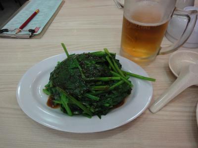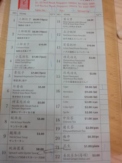 小龍包 S$7、焼き餃子 S$8、ホウレンソウのオイスター炒め S$8、挽き肉みそのせ麺(いわゆるジャージャー麺)S$5、ビール S$9×2本