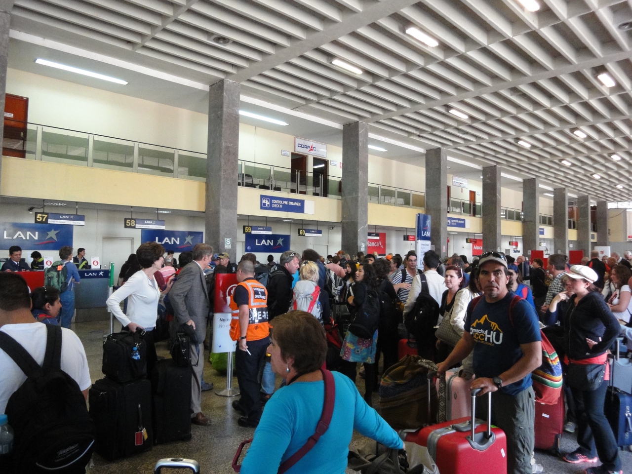 フライト出発時刻の2時間前(14:30)に着くと、LANのカウンターの前は写真のような長蛇の列。クスコ−リマ間は30分おきにシャトル便のように出ているので、チェックインが集中します。