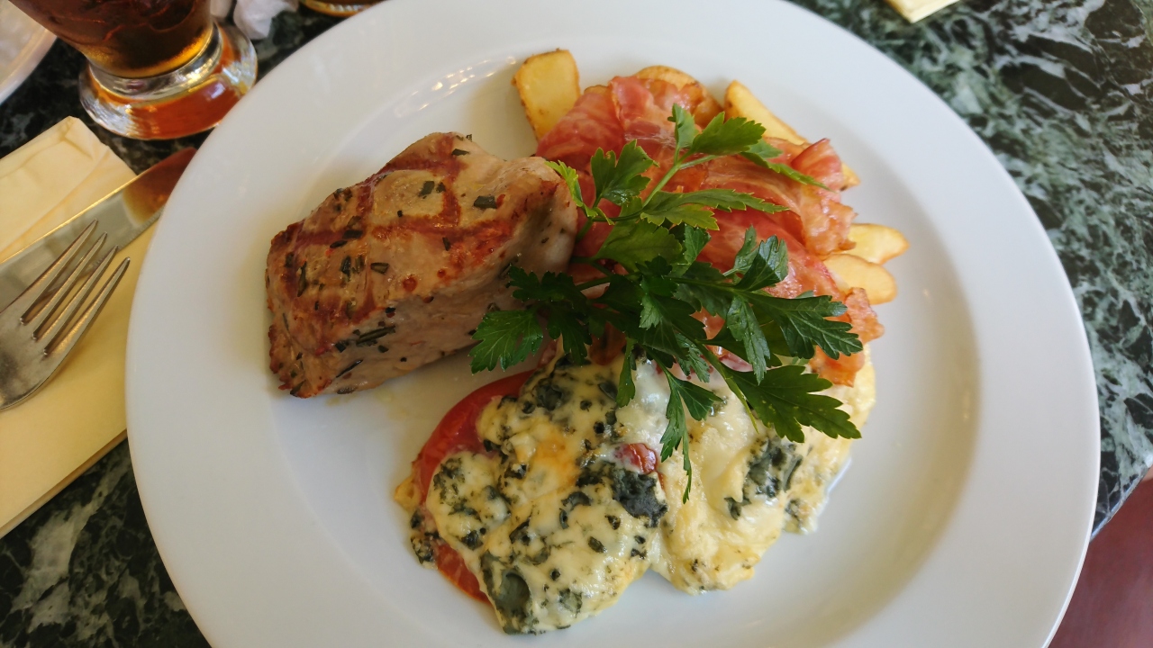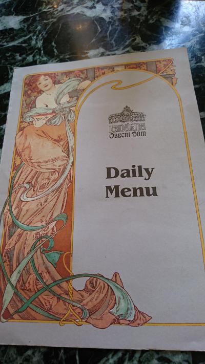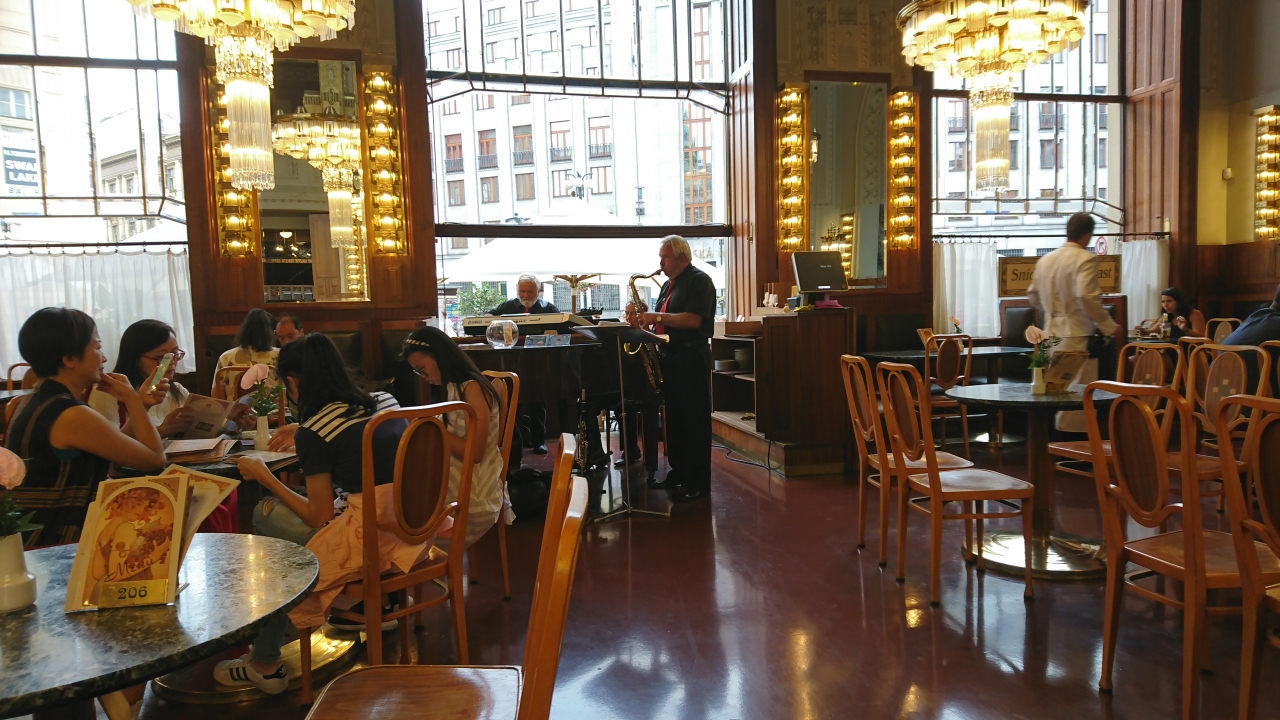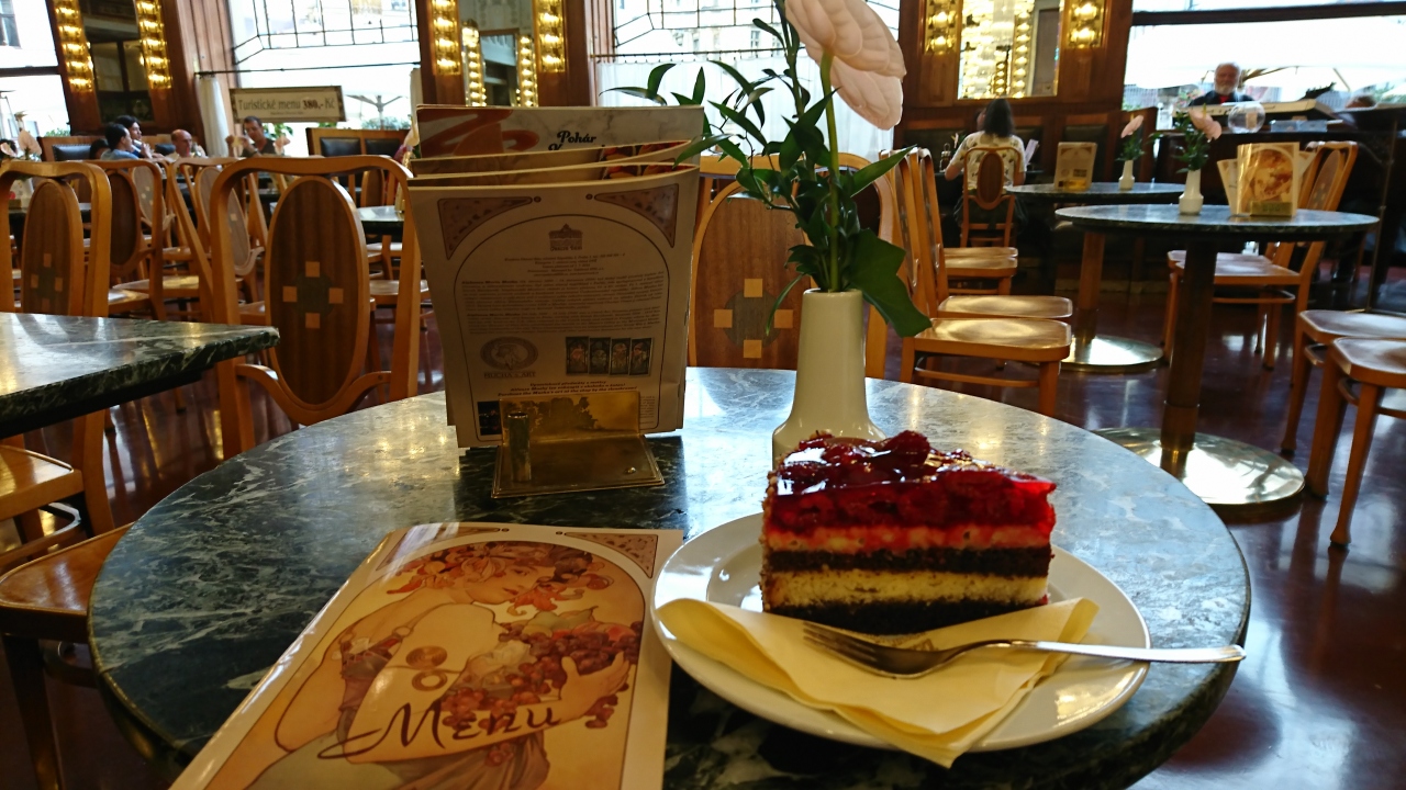 市民会館(スメタナホール)にあるカフェレストランです。アールヌーボー様式でテラス席もある入りやすいカフェでお手頃価格です。時間帯によっては生演奏もあります。ケーキはワゴンで運んでくる中から選んで注文しました。甘さ控えめのケーキで美味しかったし、肉料理も美味しかったです。メニューは独特な書体で読みにくかったです。