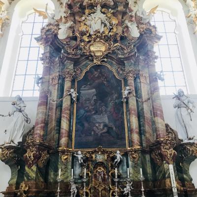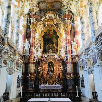 ミュンヘン駅集合のノイシュバンシュタイン城とヴィース教会、フュッセンをめぐるランチ付きのVELTRA日帰りツアーで行ってきました。ミュンヘン駅からバスで1時間もかからない距離です。高原の中にポツンとある、外から見る限りはごく普通の教会ですが、中に入ると壁一面に描かれている絵画や装飾の鮮麗さに言葉が出てきませんでした。私たちはツアーだったので楽でしたが、電車はバスで行くには大変そうです。