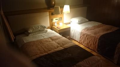 部屋の形ゆえだと思いますが、かなり広く上の写真のツインベッドの足元から...