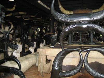 水牛の角、多分の水牛の頭蓋骨(本物かどうかは不明)、蛇、不気味なオブジェ、