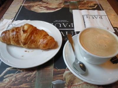 マドレーヌ地区のプランタン近くのお店には、2階にイートインスペースがあるので、いつも朝食を食べに行きます。着席してからメニューからパンと飲み物を選びます。メニューは当然フランス語ですが、クロワッサンやバケットくらいは判ります。