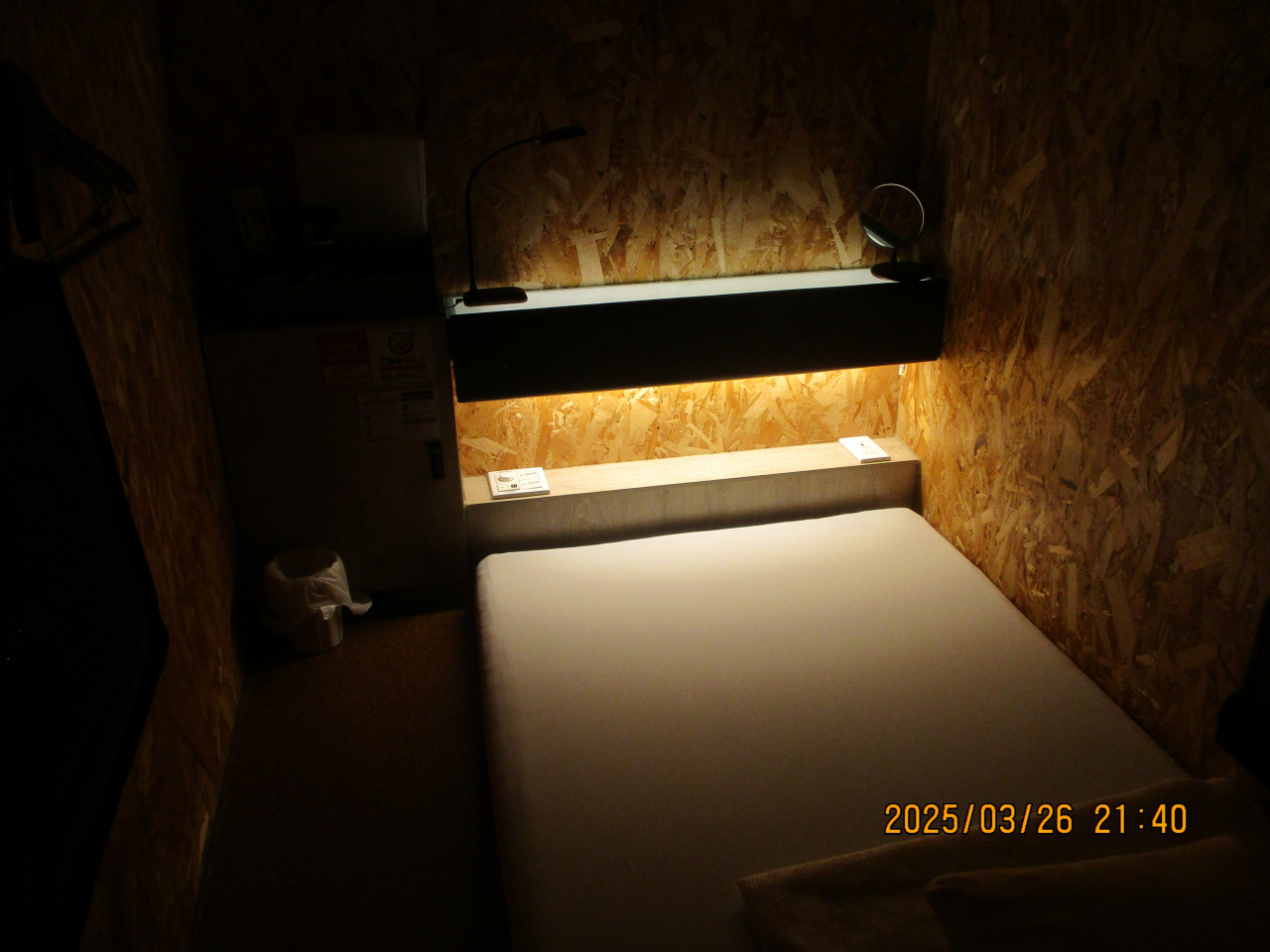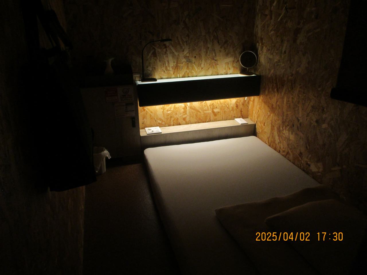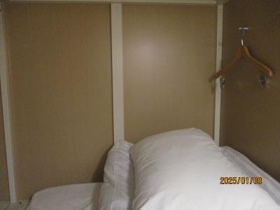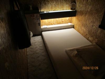 このカプセルは1泊4200円でした。食事食べ放題で、3種類のカレーライスを初め、うどん、各種のカップ麺、アイスクリームまで食べ放題でした。しかも、アイスクリームには、トッピングもありました。また、飲み物も種類が多く充実していました。ベッドルームは、天井が高く、ストレスをあまり感じませんでした。シャワーやトイレも清潔で問題ありませんでした。