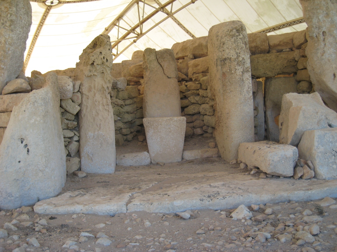 マルタで丸一日時間があったので観光致しました。時間の節約のため、渡航前に日本で、現地旅行社にチャーターを依頼しておりました。写真は、世界遺産の一構成資産であるハジャール・イム神殿です。保全に注力しているからか、全体がシートで覆われていました。
