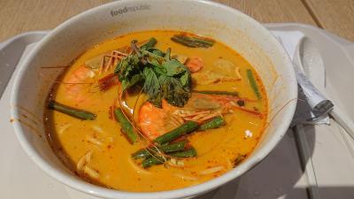 こちらではカリー・プラウン・ヌードルを注文しました。麺は3種類の中から選べ、タマゴ麺を選択しました。スープはタイ料理のイエロー・カレーのような味で美味しかったです。- 旅行時期