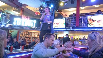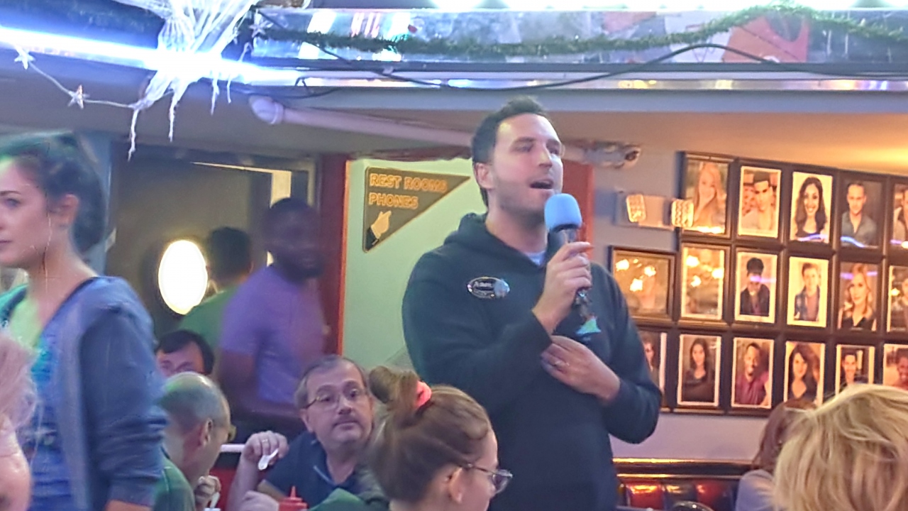 ブロードウェイの舞台を夢見る若者が歌いながらサービスを提供するお店という事でやってきました。