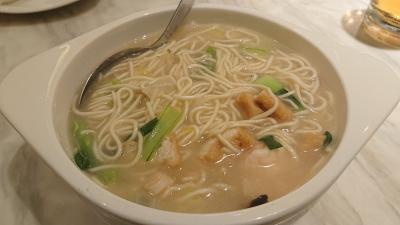 名物の海老のラーメンは、ガイドブックのオススメに従って汁なし(ドライ)を注文しました。海老の出汁が効いたスープも付いてきます。