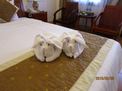 タオルのかわいい豚ちゃんがお迎えしてくれたフォーホイリバーサイドホテル...