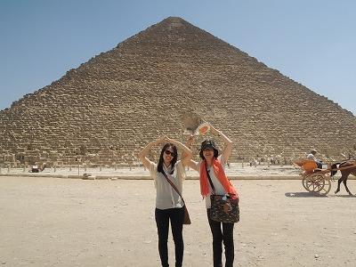 ピラミッドのすぐ近くまでバスで移動ピラミッドのポーズで記念撮影