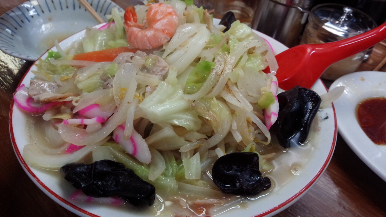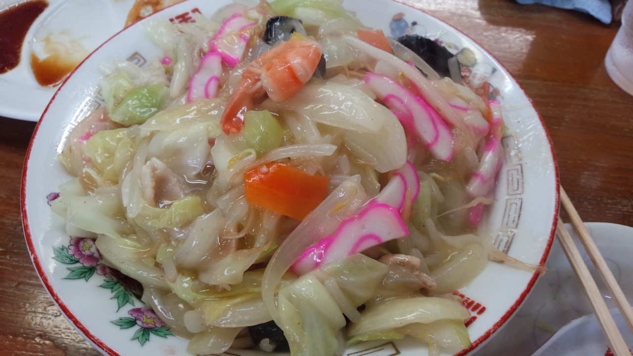 チャンポンと皿うどんを食べましたが、チャンポンは特に野菜が多くてなかなか麺にたどり着かない感じで、海鮮は少な目です。皿うどんは細麺と太麺があり細麺にしました。