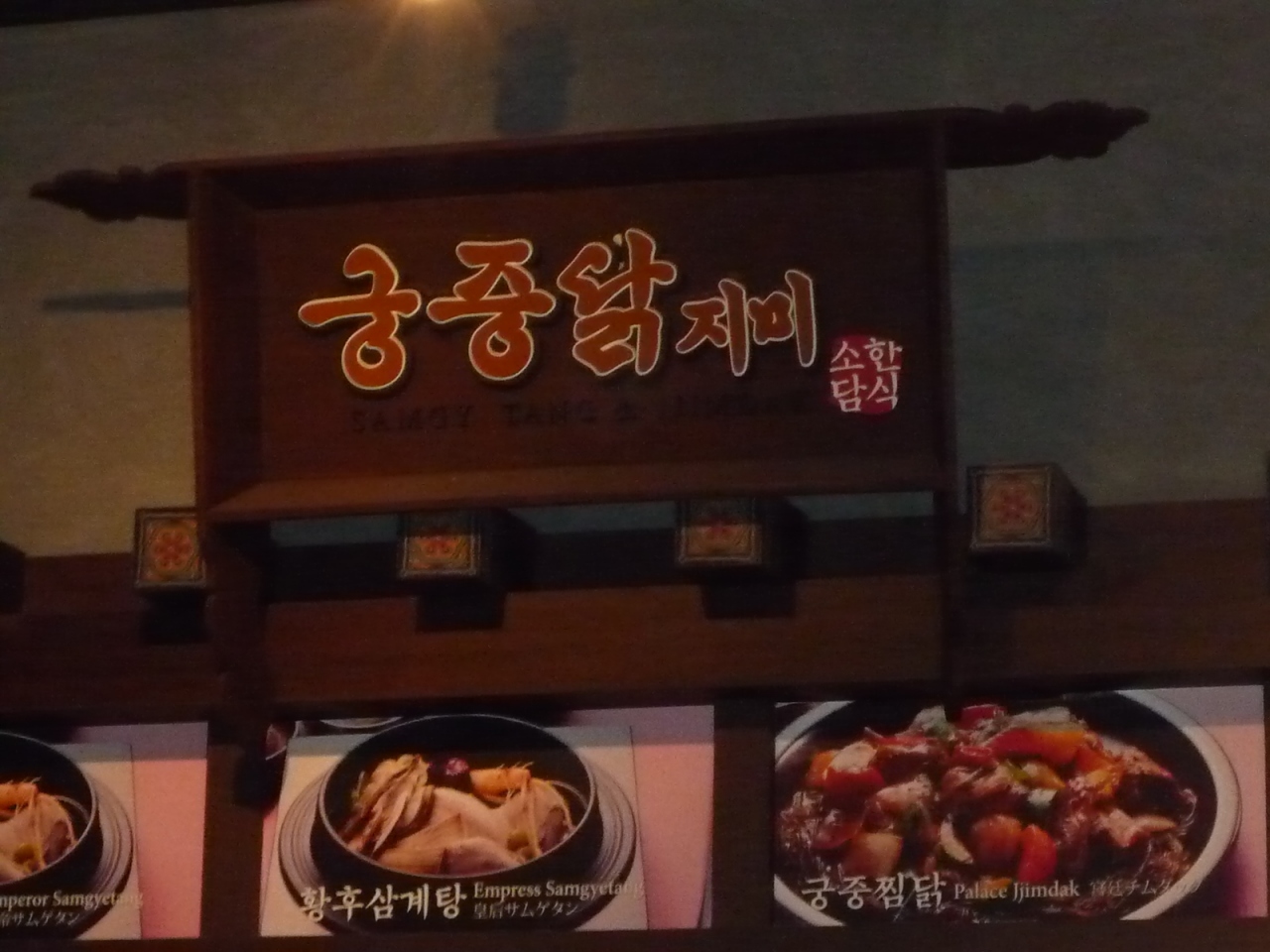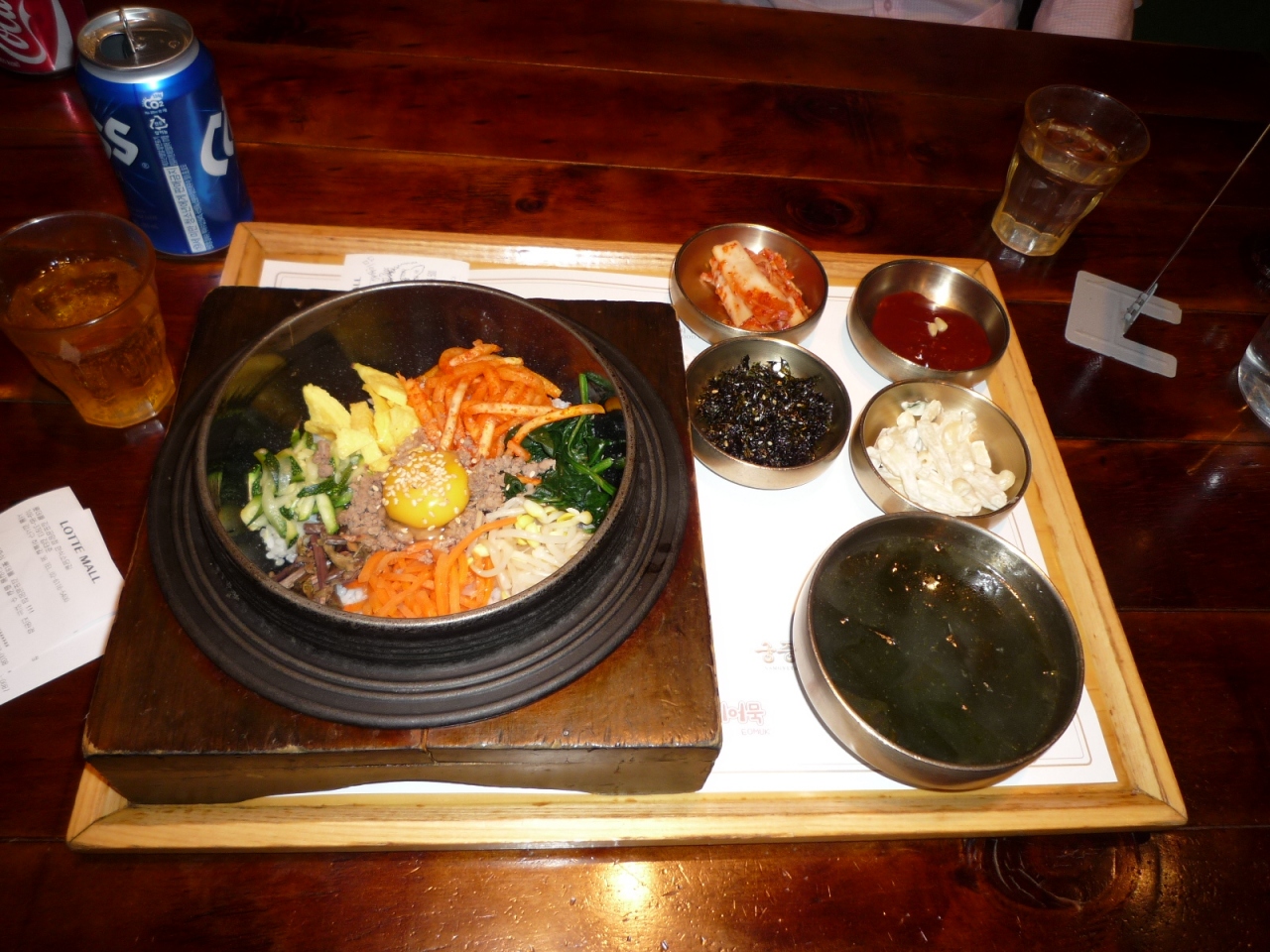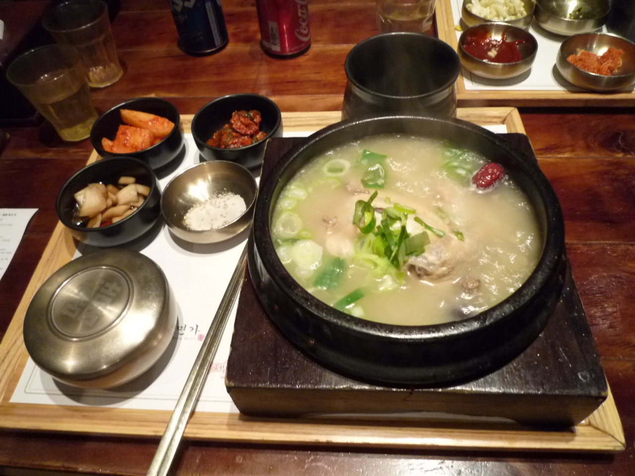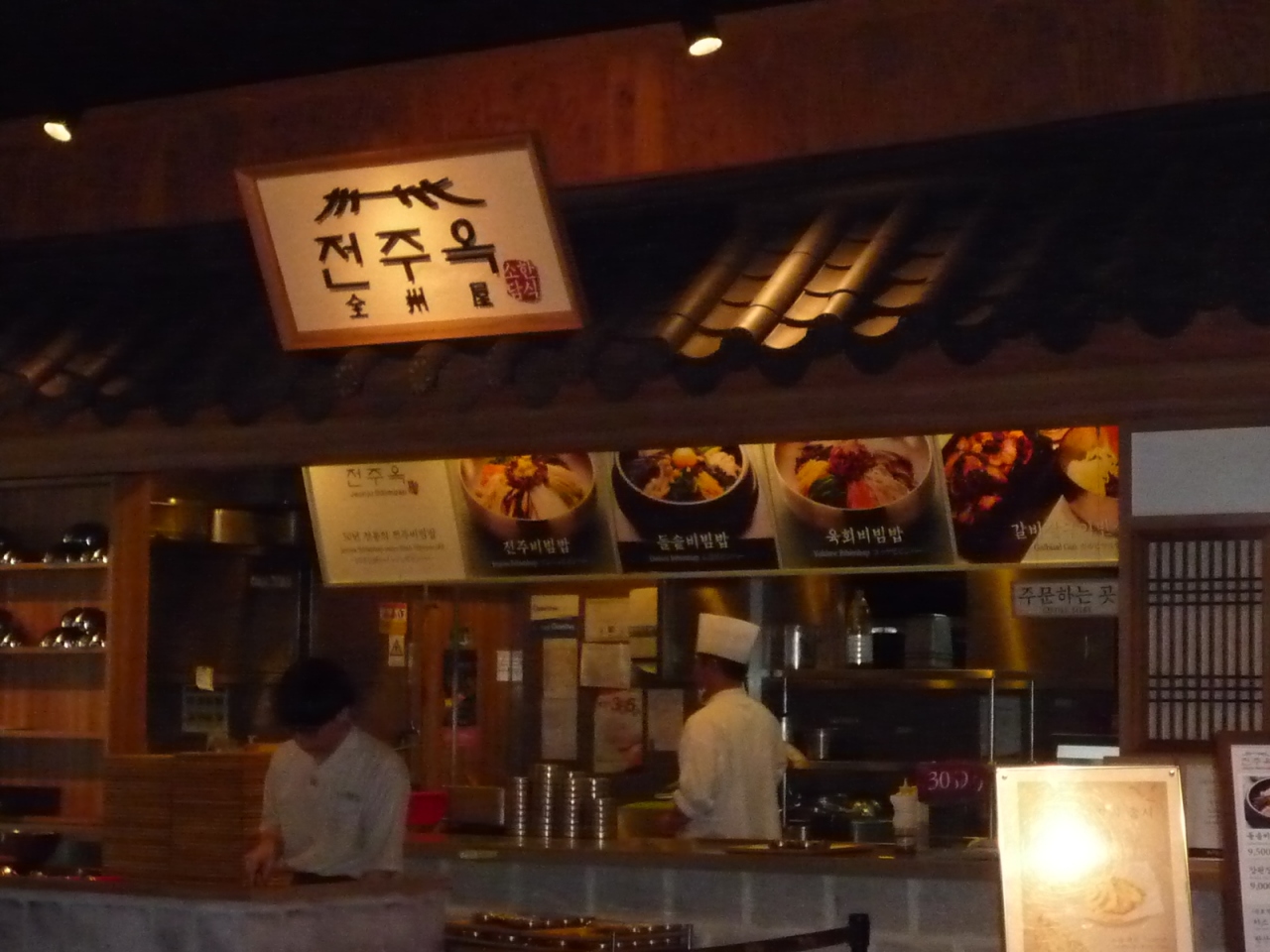 ロッテモールの中の韓国料理のフードコートが集まったようなシステムの店です。コーナーによって別々に会計になります。味の方は普通でしょうか。市内で食べると中途半端な時間ならそれぞれ違う物も食べることもできますし、ここで食べるのもありかなと思いました。サムゲタンは鳥の中にはもち米が少ししか入っていませんが、ご飯が別に付いていて以外と食べやすく日本の韓国料理屋で食べるよりは美味しかったです。付け合せは少なめでした。