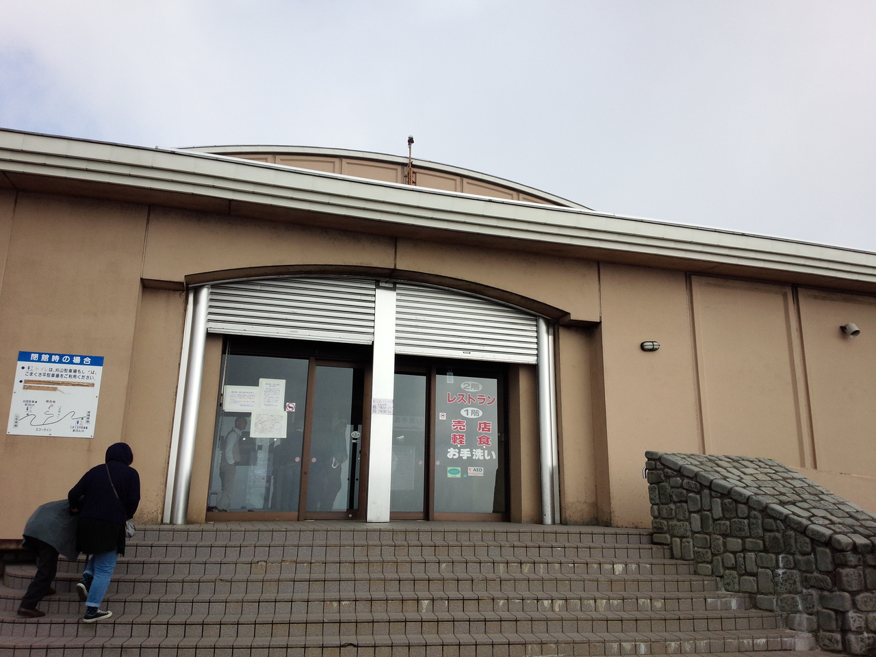 強風で寒かったためレストハウスの中は混んでいて、自動販売機の温かたい飲み物は全て売り切れていました。