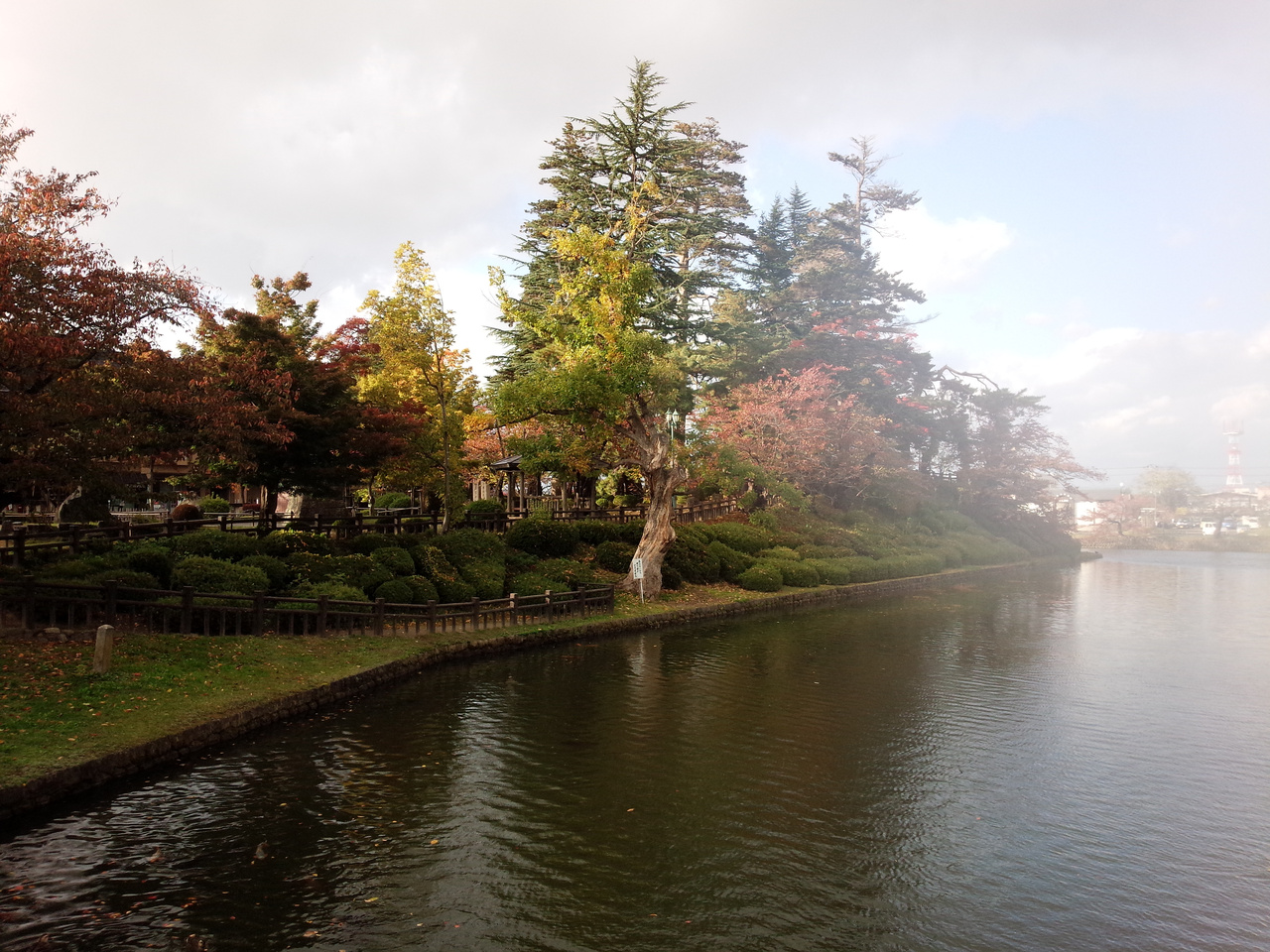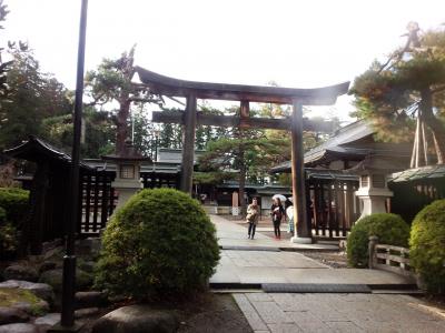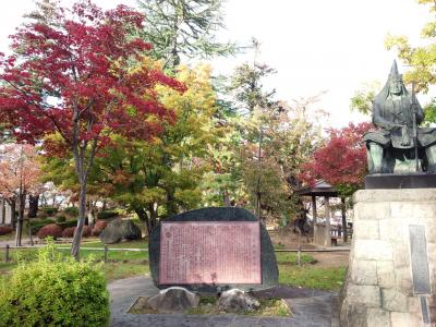 米沢城の城跡のようですが、お城があったというのは立派なお堀以外はあまり感じる事は出来ませんが、少し高くなった招魂碑の所からお堀と綺麗な紅葉を見る事ができました。上杉謙信公の銅像や、上杉鷹山の銅像、天地人の像、直江兼続などがありました。