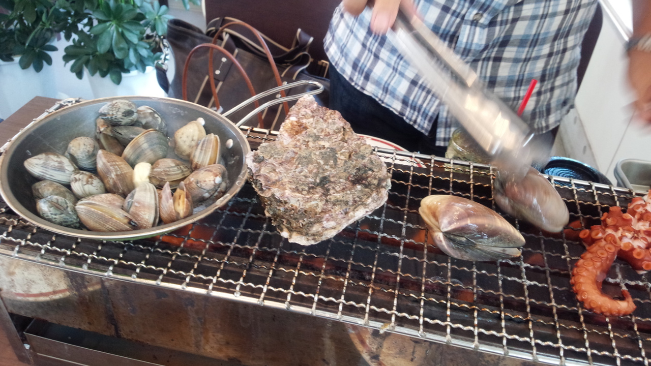 先日アウトレットに行った時から気になっていたので入ってみましたが、コンロがあって、室内は締め切られてはおらず窓は開けっ放しなので暑かったのですが、貝などの海鮮をコンロで焼きリゾート気分になりました。夏休みなので家族連れが多かったです。