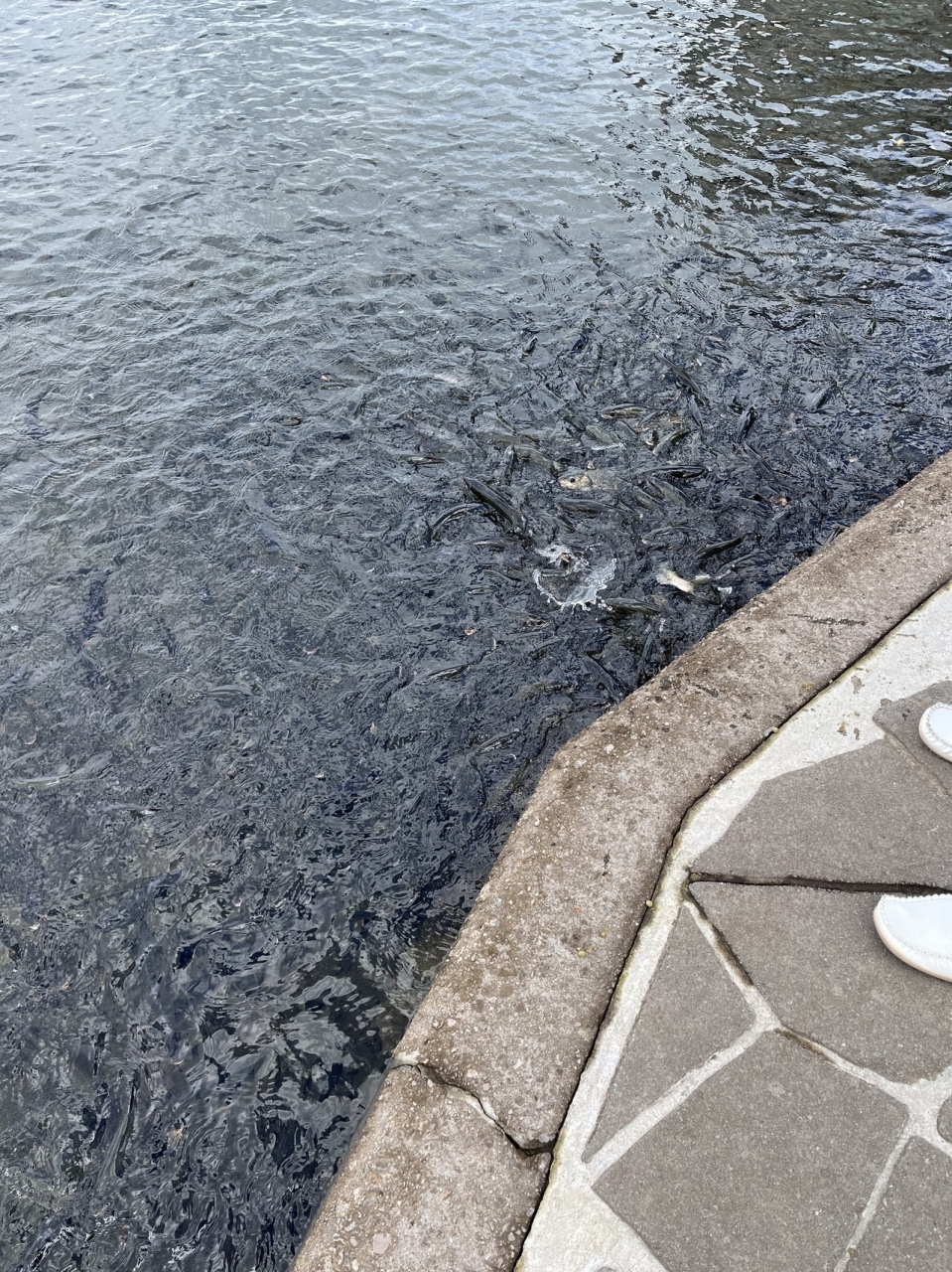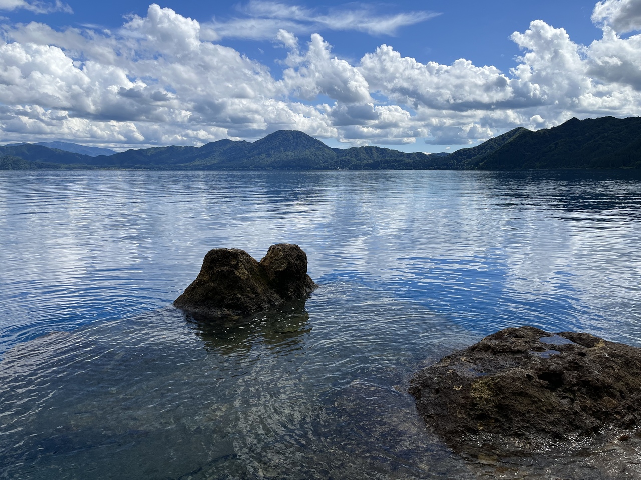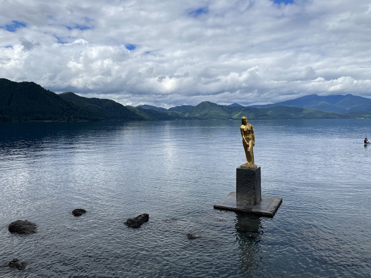 角館方面から乳頭温泉温泉に行く場合必ず通る有名観光地の田沢湖はで日本一の深さがある湖なので、以前にも来た事はあるのですが寄ってみました。田沢湖といえば有名なたつこ像の側から見る湖もちろん綺麗でした。そこでウグイに餌をあげている人がいたので、ものすごい数の魚が寄ってきていて魚が魚の上に乗りあげるほどのすごい魚の数でびっくりしましたが、たつこ像の側だけでなく御座石神社方面も是非行ってみてください。そちらから見る湖はたつこ像の側以上にものすごく青くて綺麗でした。