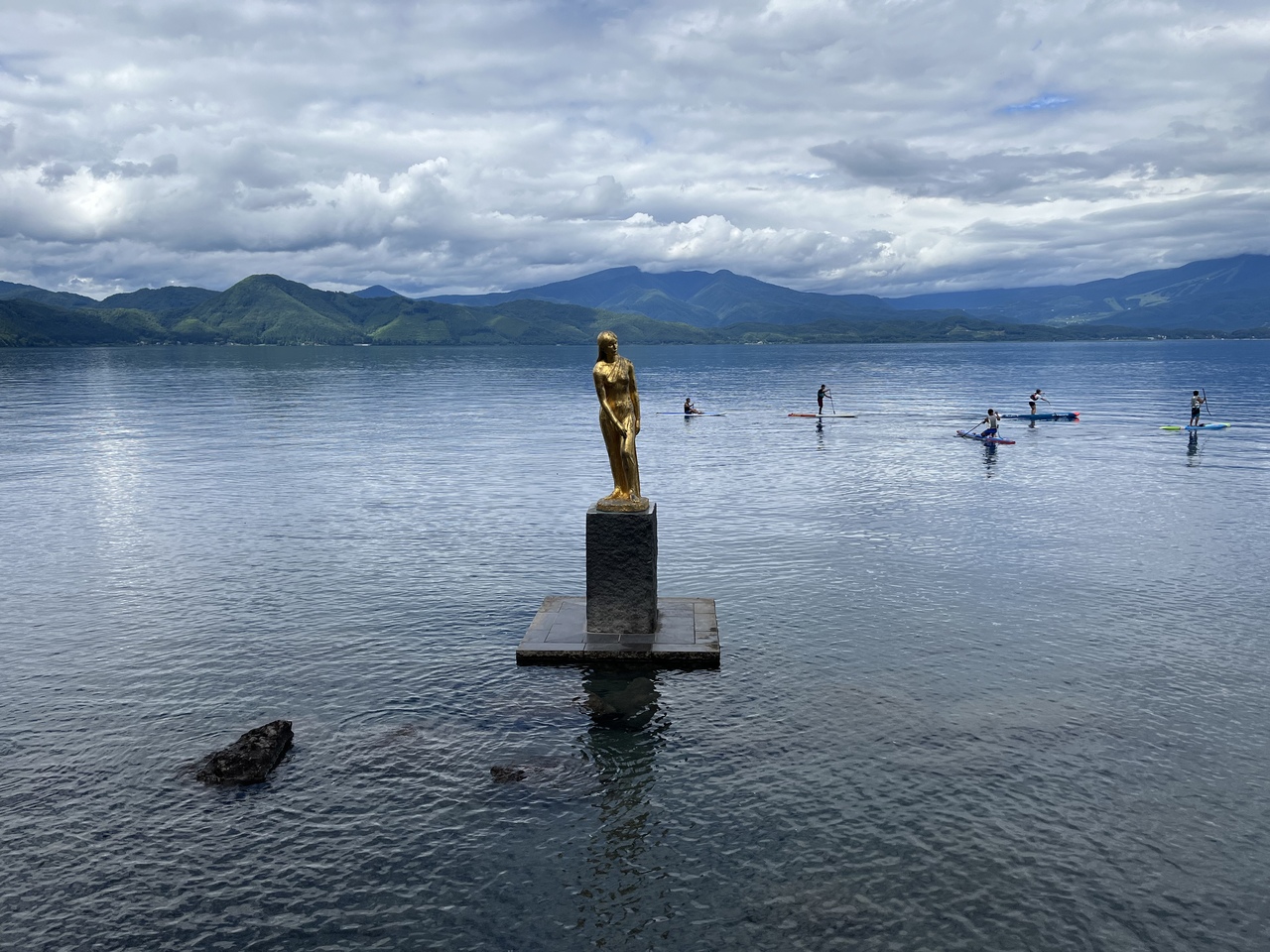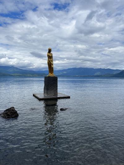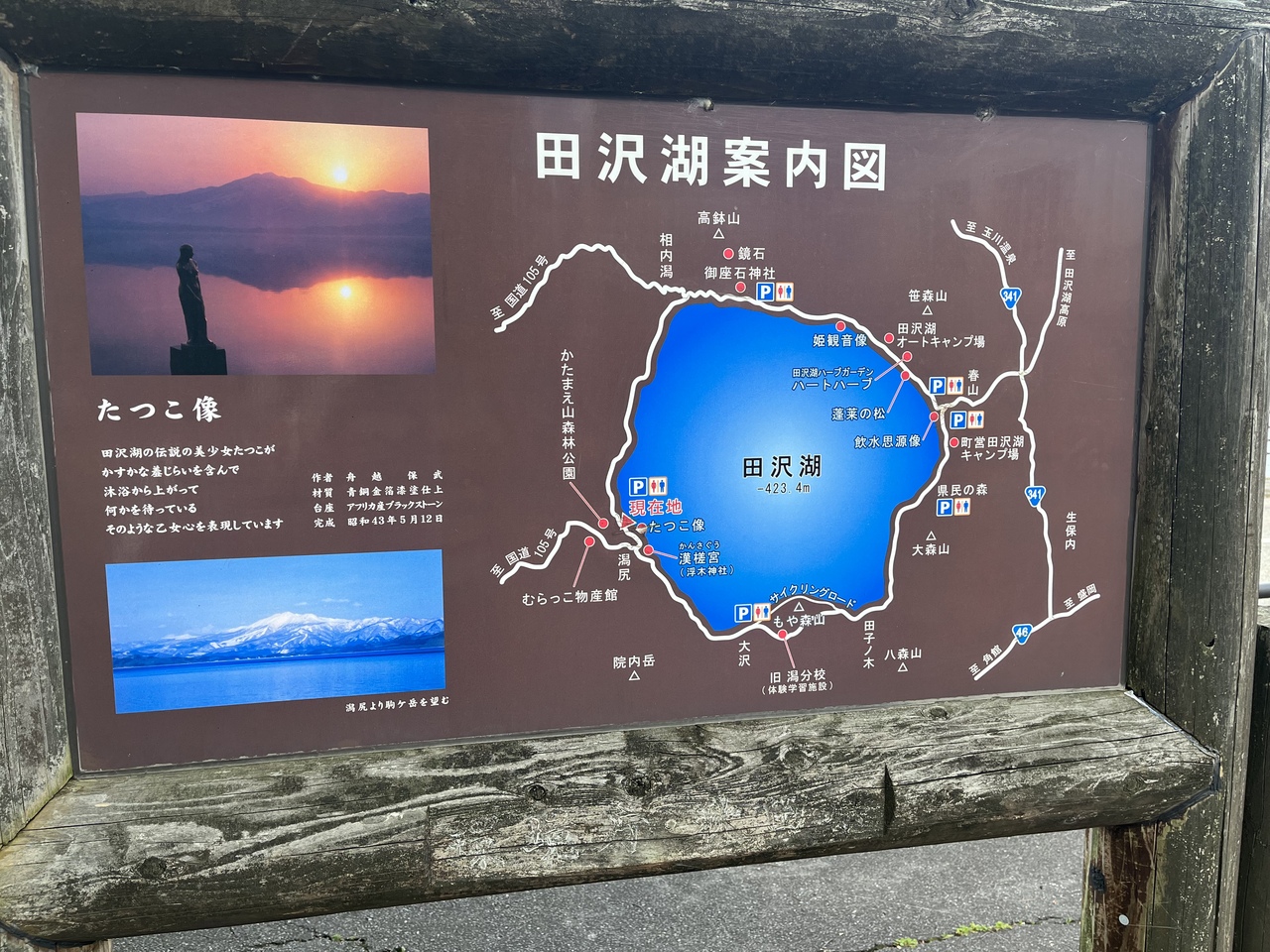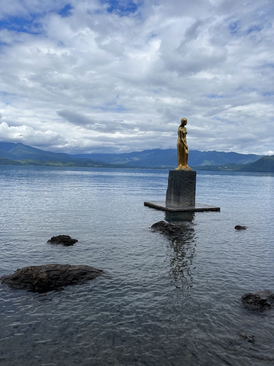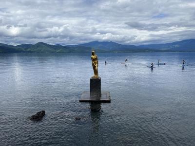 田沢湖といえば金ピカのたつこ像はガイドブックなどにも出てくるシンボル的な物です。駐車場は近くのお土産物屋さんしか見当たらなかったので、駐車して少しだけ飲み物などを購入しました。田沢湖の綺麗な湖に金ピカの像はとても目立ちますが、永遠の美を求めて湖の水を飲み干した辰子さんには金ピカで目立った姿の銅像はピッタリあっていてる像かもしれないです。