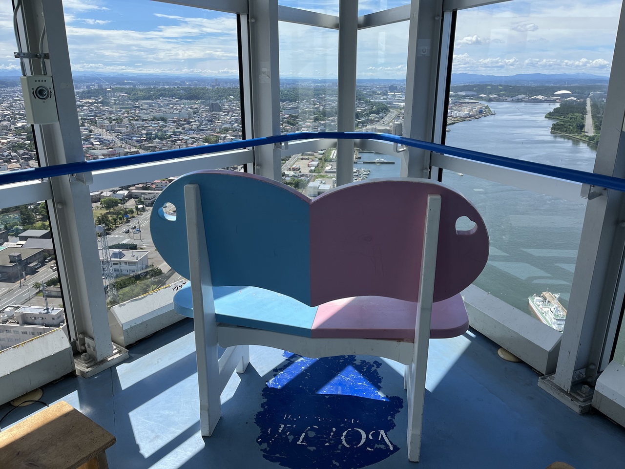 秋田港にあり市内よりは少し離れていますが、朝9時から夜の9時まで高さ143メートルの高さのタワーに入場料無料で登れるのが嬉しいです。営業時間が長いので夕焼けの時間や夜景なども見れますし、夜はライトアップも行っているようです。秋田のデートスポットなのか映え写真のためかハートの椅子もあります。天気が良ければ昼間もいい景色です。