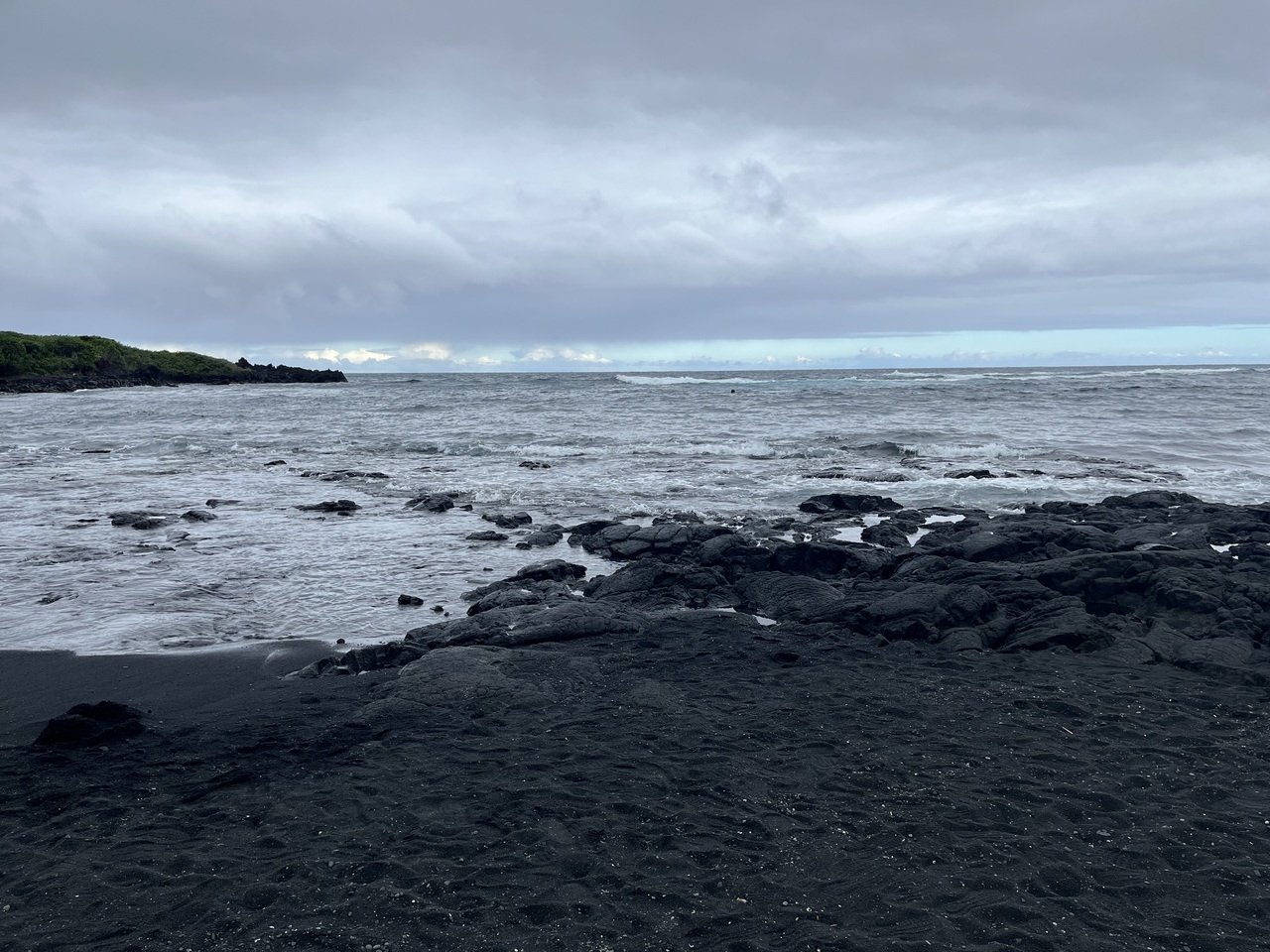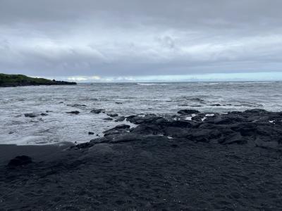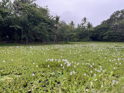 天気がよくなかったので、やはりホヌはいませんでした。海亀さんは甲羅干しをするので天気がよくないと可能性は低い様です。ホヌがいないので滞在時間が短い様で海岸に近い方の駐車場もいっぱいですが、すぐに空く感じでした。ホヌが黒砂の海岸だけでもいい景色です。池にはホテイアオイの花がいっぱい咲いていて面白い景色でした。