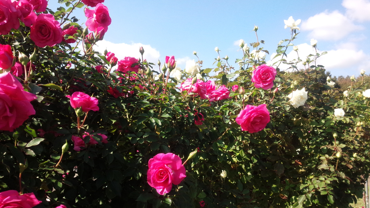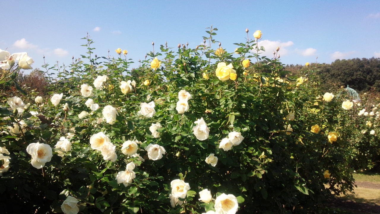 秋バラの時期10月、11月は入場料1000円です。秋バラが見頃で、11月の上旬くらいまでは色々なイベントも開催しているようです。花の種類、場所によってはまだのものもありましたが、綺麗に咲いていてアマチュアカメラマンもいっぱいいました。売店パティオでバラソフトクリームを買い座って園内を見渡すこともできました。