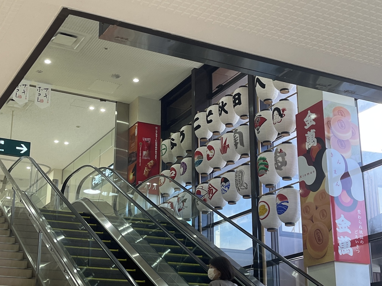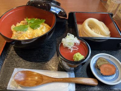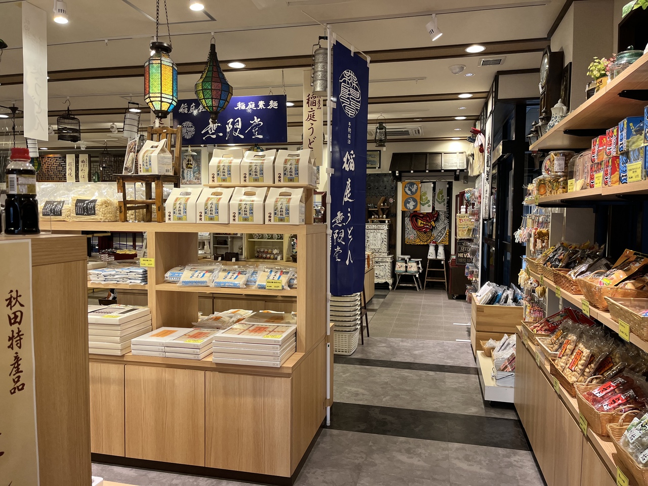 1階はお土産屋さんで2階は食事処です。1階もお値引き品もあったり、結構品揃えがありました。2階のレストランも天井賀高くて席も結構席と席は離れいるのでコロナ禍にはいいお店かもしれません。比内地鶏の親子丼と稲庭うどんのセットを食べましたが、親子丼がトロトロでとても美味しかったです。