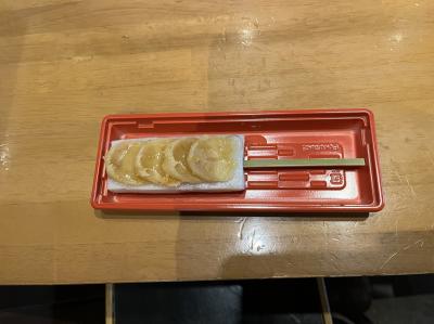 羽生サービス下りは鬼平犯科帳のイメージという事で全体の雰囲気は和で統一されています。その中で小腹がすいたおやつとして外のお店には鯛焼きなどもありましたが、葛餅で有名な船橋屋さんの串に刺さった葛餅に季節限定のあんず餡が餡がのったものを食べてみましたが、さっぱりした味で美味しかったです。