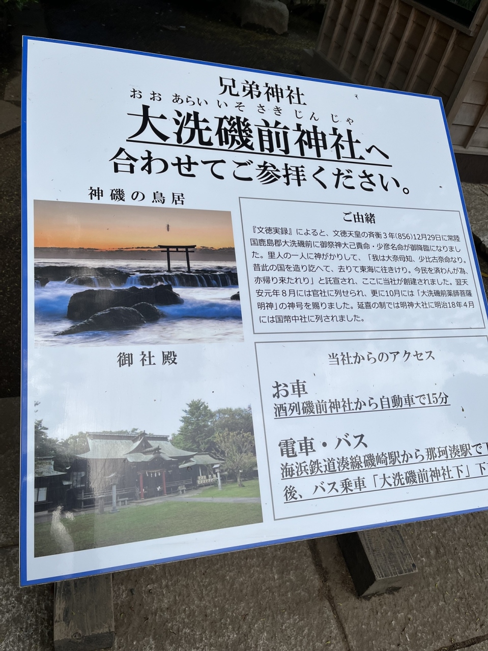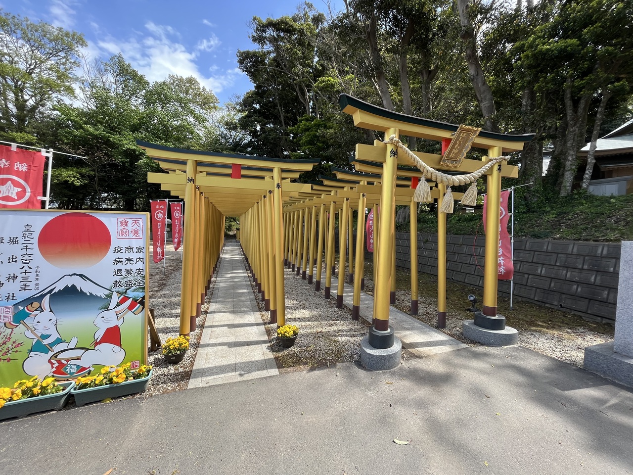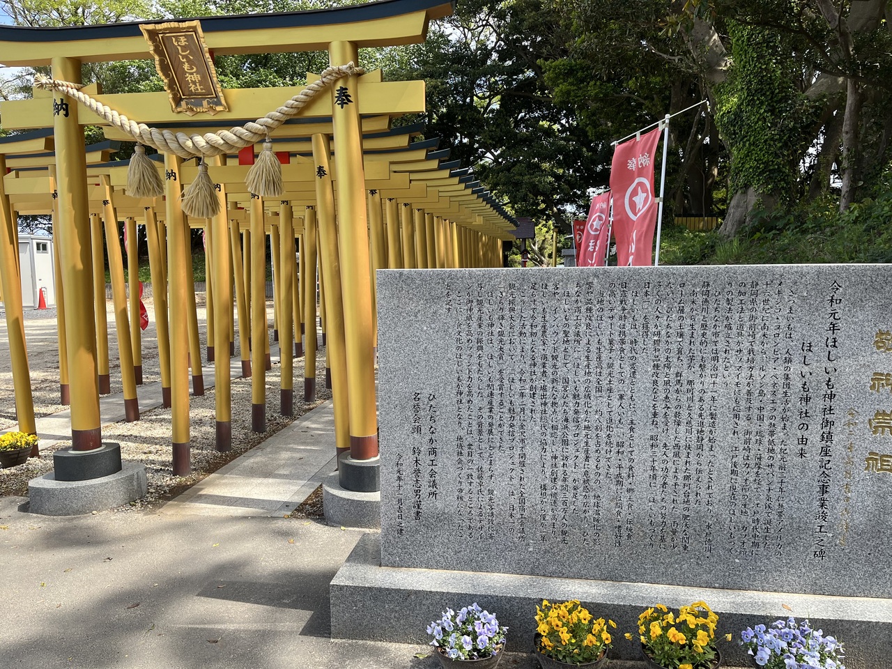 ひたちなか海浜公園から酒列磯前神社に行く途中に寄りましたが、阿字ヶ浦駅のそばです。ほしいも神社に近づいてくるとほしいものお店がいっぱいあってほしいも気分が盛り上がります。境内はほしいも色というか金色一色でした。鳥居もいっぱい並んでいて欲しい物を叶えてくれる神社だそうです。絵馬もほしいも型です。その他バイク、軽トラ、自販機などもほしいも色でした。隣には古くからありそうな堀出神社があります。ほしいも神社を神社と見るか観光スポットと見るかは微妙ですが話のタネには寄ってよかったです。