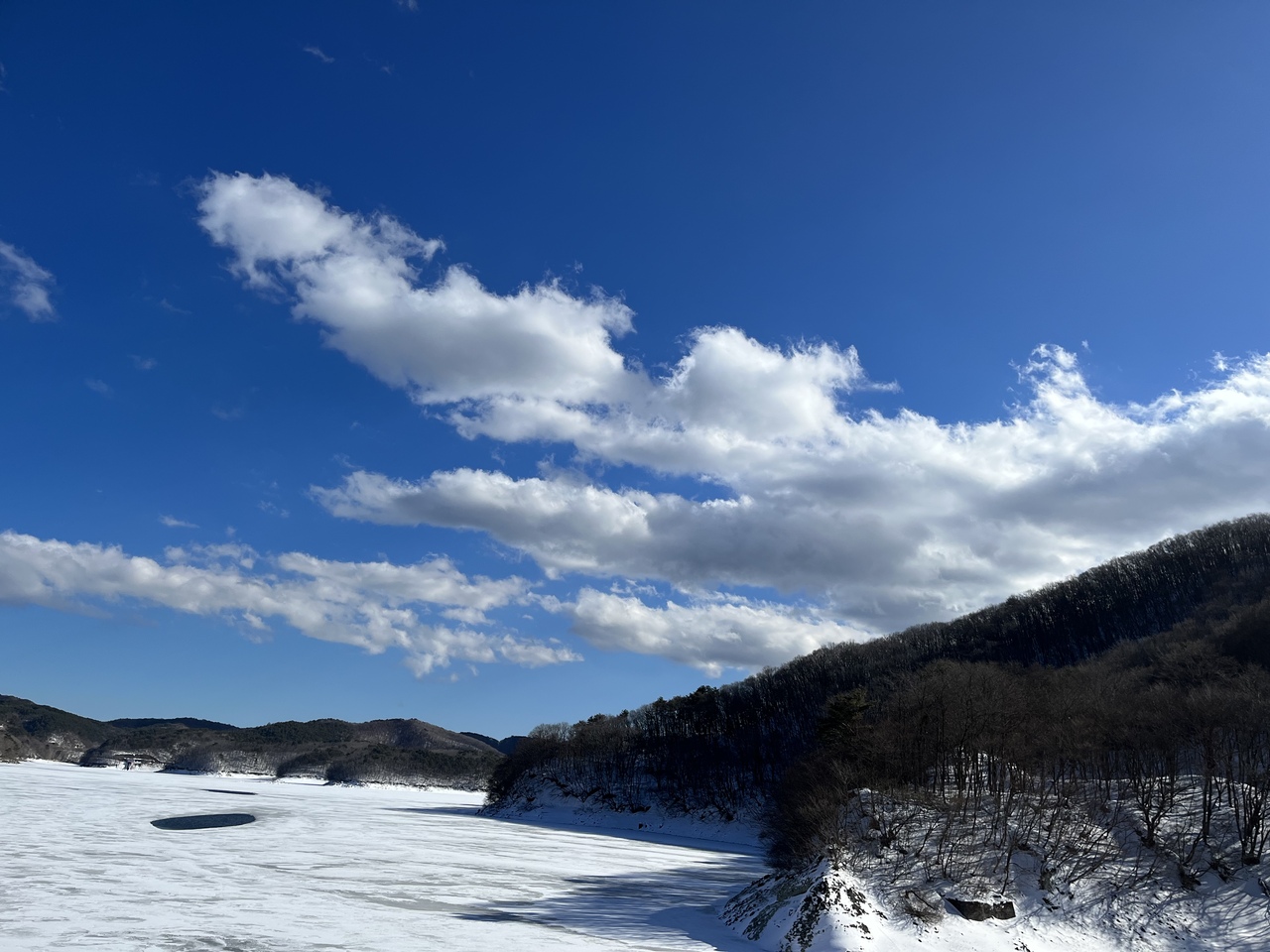 羽鳥湖の道の駅に行く時に通りましたが、羽鳥湖が中央部に一部凍ってない場所が残っていましたが、ほとんど羽鳥湖が一面凍った上に雪が積もり真っ白の一面の雪景色という絶景で最高でした。ただ雪道で走りづらいのでそんなにおすすめはできません。