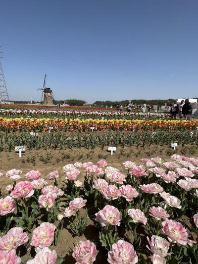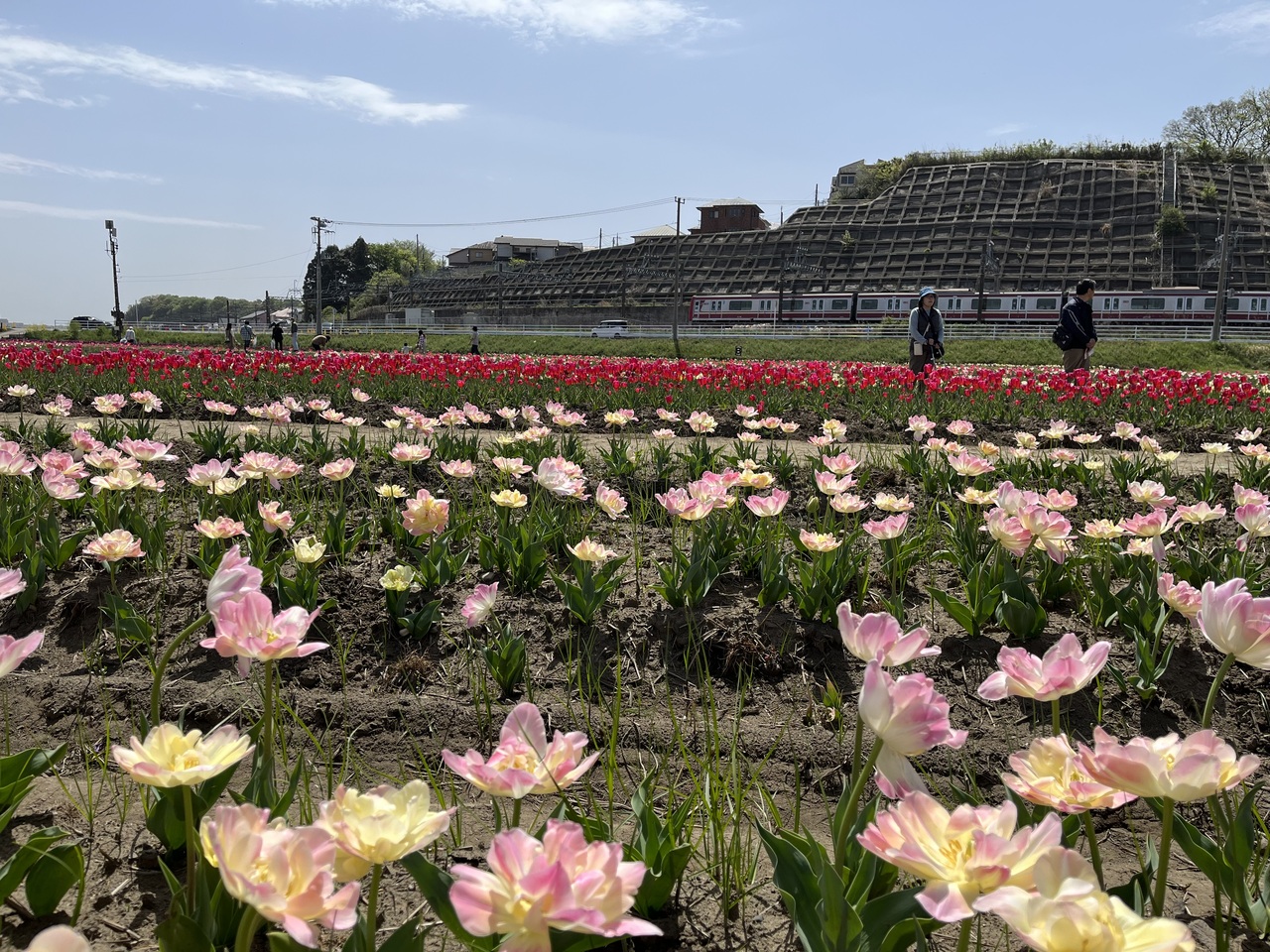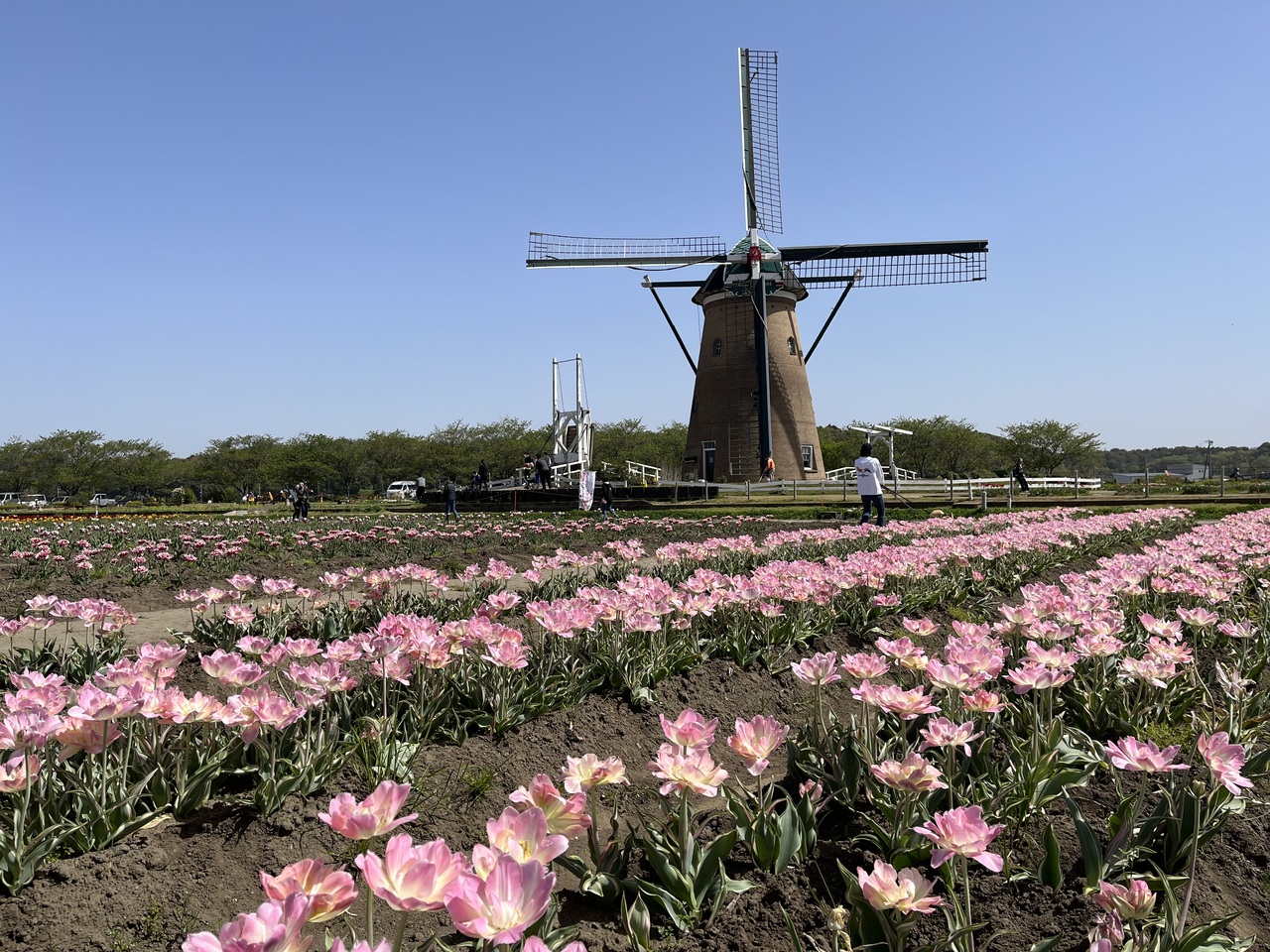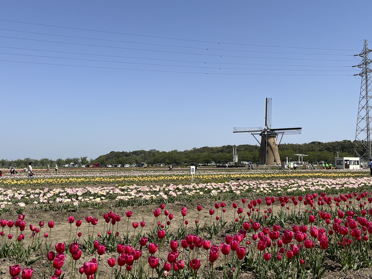 千葉県で最大規模のチューリップまつりといえば、佐倉チューリップフェスタです。2023年は3月29日から4月23日までですが、今年は花が早いのでもう終わりかけた花も多かったです。入場料は無料ですが、駐車場は一台1,000円かかります。チューリップの掘り取りができ、500円で土日は10本、平日は15本ですが、そのため後半の日程に行くと綺麗に咲いているゾーンでもポツポツと抜けた場所があったりしています。ただチューリップの数、風車とのコラボレーションは素敵で、チューリップと京成電車との写真も撮れるのもいいですね。端の方にはレンゲも咲いていました。