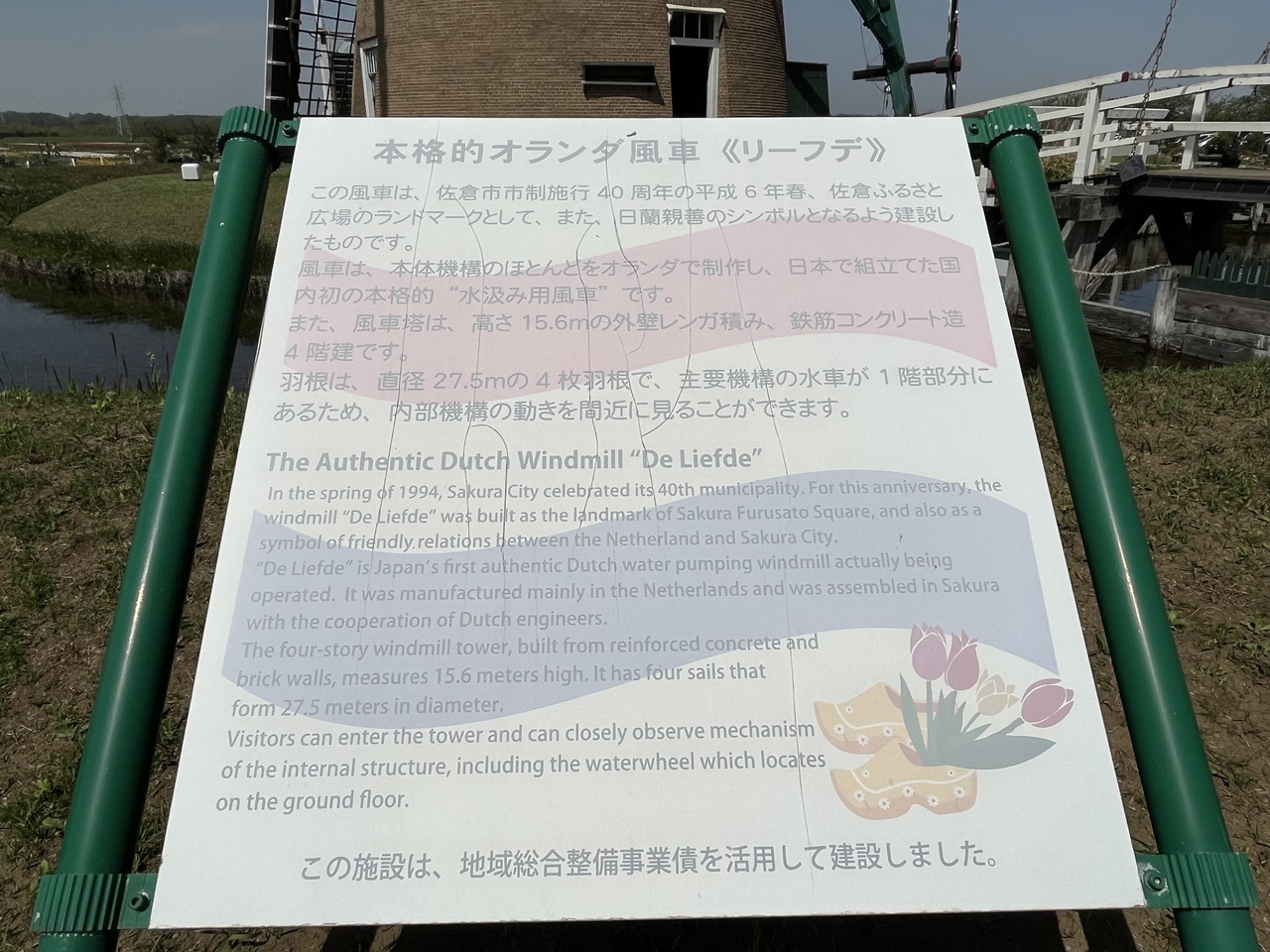 佐倉ふるさと広場にある風車です。佐倉は蘭学の頃からオランダと関係がありオランダ人が設計した本格的な風車で靴を脱いで上に登ることもできます。2階には自転車大国のオランダの自転車や木靴が置かれていました。窓からはチューリップ畑を見ることもでき風車の種類や説明もあったので開いていれば登ってみるのもいいと思います。1階にはオランダ生まれのキャラクターミッフィがいっぱいいました。