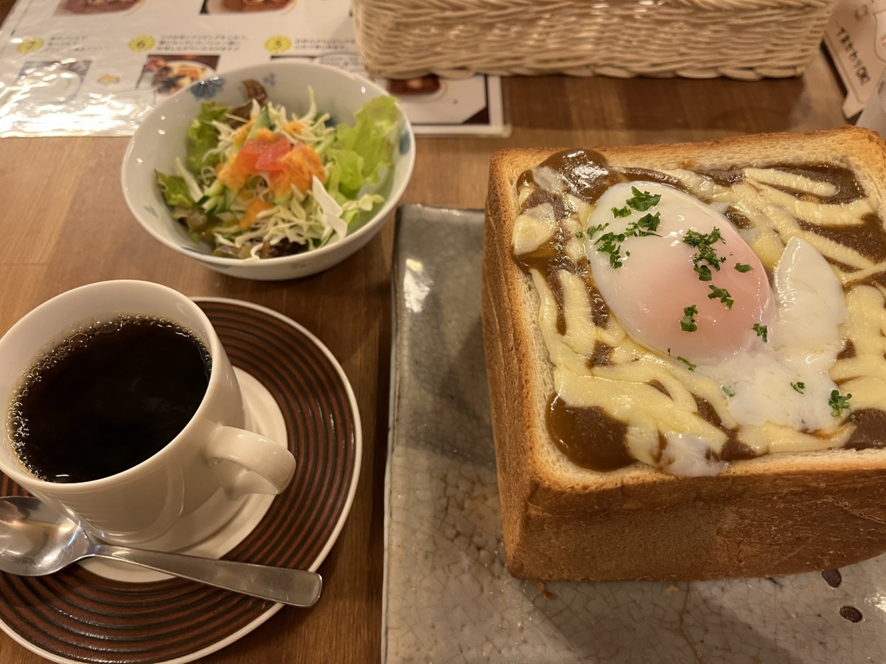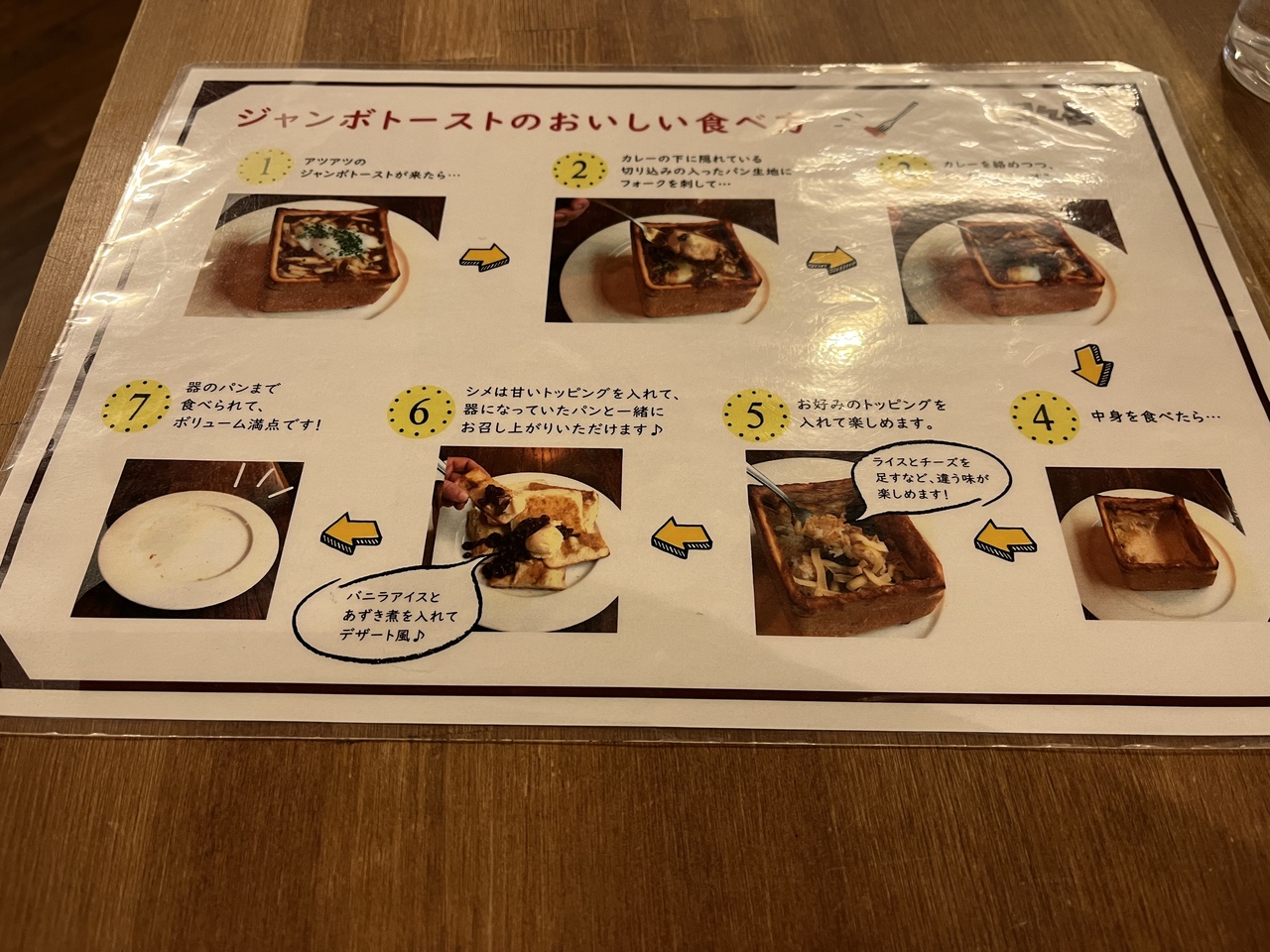 千葉の昔PARCOなどがあったあたりから県庁へいく通りにある喫茶店です。雨が降っていたのでお店はすいていました。ジャンボトーストが有名とのお店なので、カレージャンボトーストを食べてみましたが、大きなトーストが繰り抜かれ中にカレーが入っています。カレーを食べていくと、トーストが大きくてカレーが早くなくなるので別料金のトッピングで小豆やハニーシロップなどを使ってデザート的に食べるのがいいらしいです。ただ、お腹いっぱいだったのでトッピングはせずにおとなしく残しました。美味しいパンですが、トーストされているので耳の部分の下の方は硬めなので食べづらいかな。話しの種にはいいですが、多分二度と食べないです。少なめがいい方にはハーフもあります。外ではフルーツサンドなども売っていました。