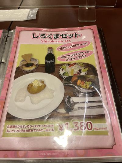 千歳空港にはスープカレーの専門店が別にあるのですが、そちらのお店は行った事もあり混んでいたのでこちらのお土産にお邪魔してみました。コカコーラのシロクマの側にあるお店です。コカコーラの側にあるからか瓶のコカコーラのついた白熊セットという物を頼みましたが閉店間際だったのでプリンはなくポタージュになるという説明がありましたが面倒くさいのでそれを注文しました。カレーもポタージュ、蒸したじゃがいもも美味しく、北海道の形のご飯も嬉しかったです。