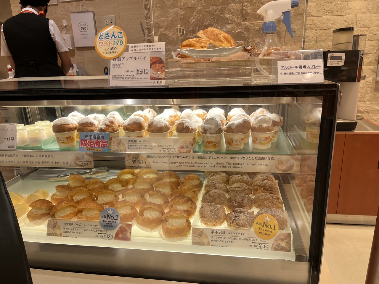 北菓楼といえば開拓おかきのイメージですが、シュークリームは、人気ナンバー1のジャンボシュー北の夢ドーム(税込180円)、ナンバー2のジャンボパイシュー夢不思議(180円)千歳空港限定カップシュー夢風船(243円)などシュークリームが豊富でお手頃価格です。今回は限定という言葉に弱い私は夢風船を買いましたがとてクリームたっぷりで美味しかったす。ただ、当日に食べなくてはいけないので自分用のお土産以外には無理です。シュークリーム好きなら是非寄ってみてください。ほっかろうとずっと思ってましたが、きたかろううと読みます。